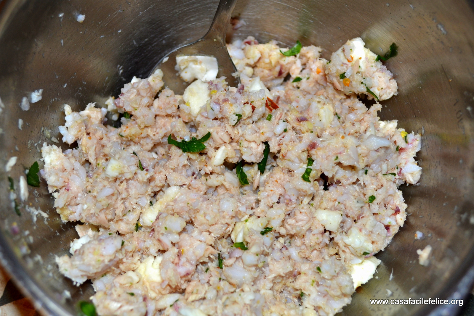 In una ciotola, mettete il tonno, il trito di calamaro e la mozzarella tagliata a pezzettini, aggiustate di sale e amalgamate con l’albume; se necessario, asciugate il ripieno aggiungendo il pane grattugiato