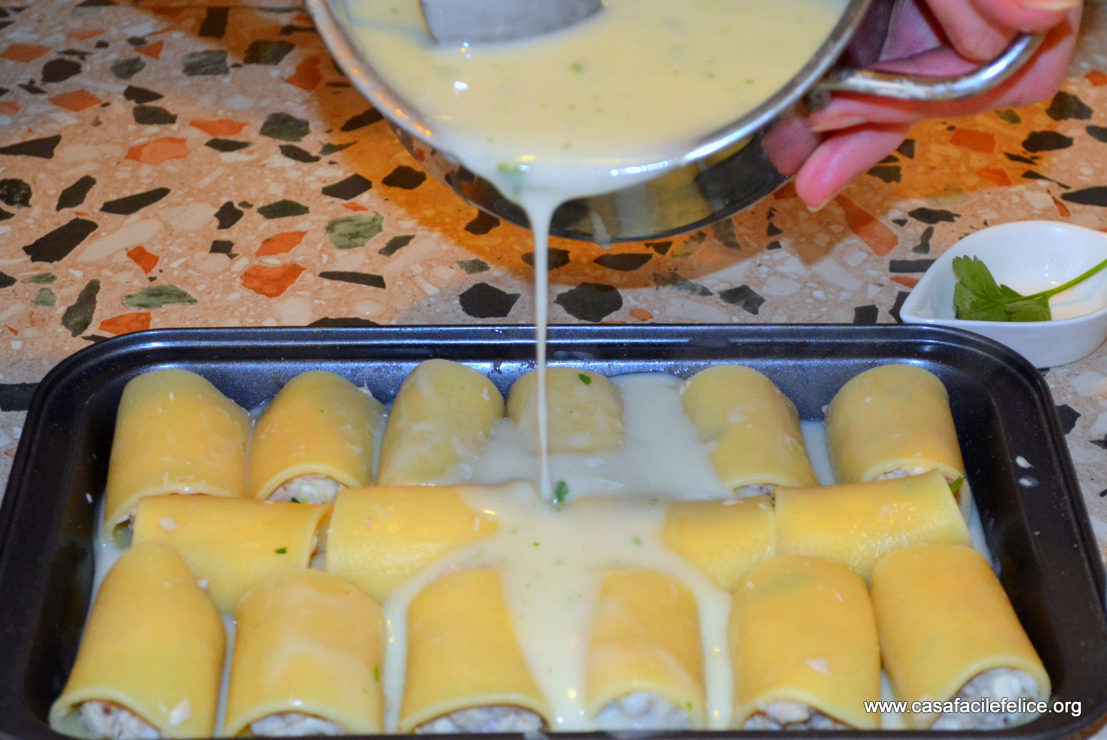 allineateli in una teglia che possa stare in forno, dopo averla cosparsa di salsa bianca;