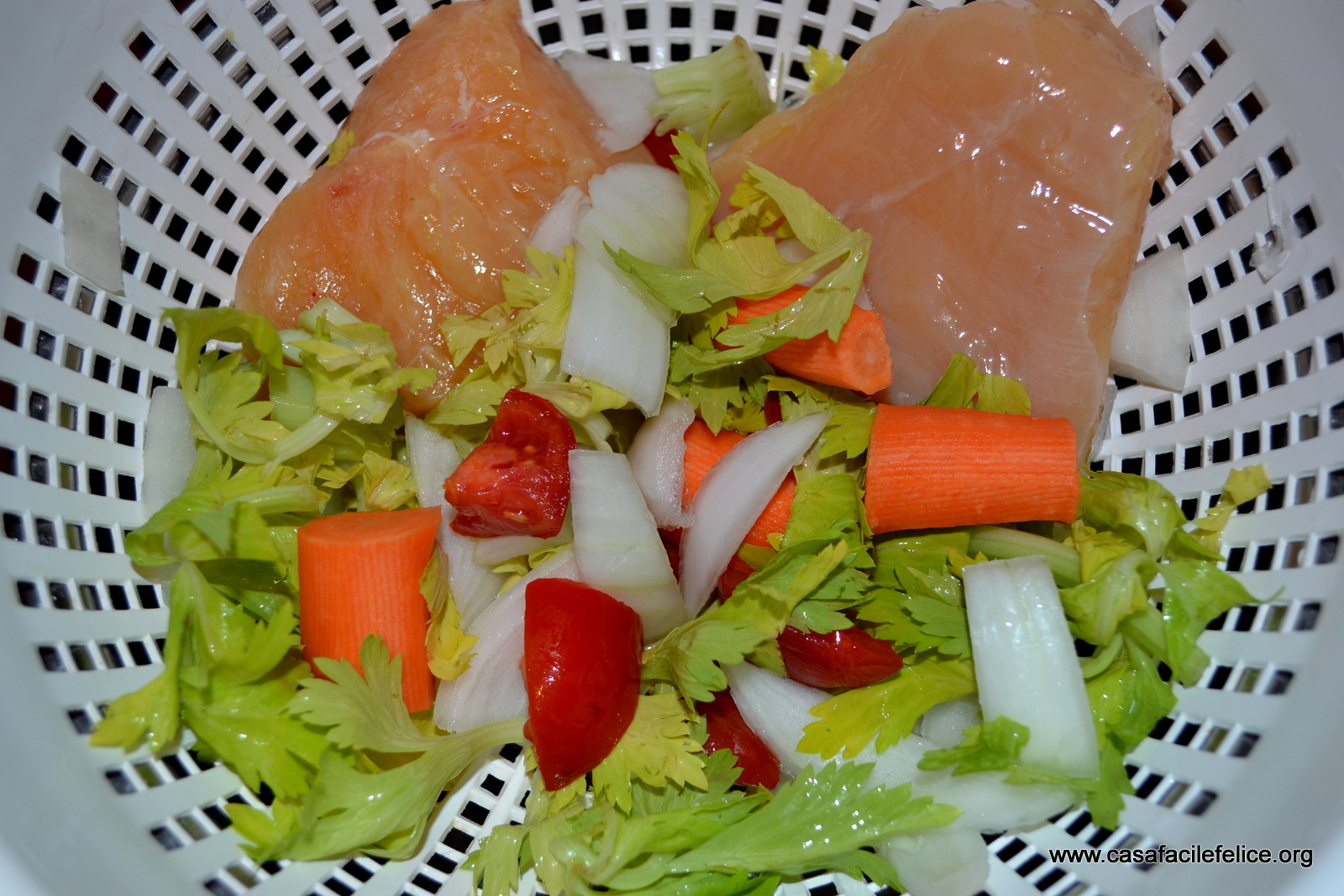 Lavate le verdure, tagliate la cipolla e il sedano in pezzi grossolani; pelate la carota e tagliatela in pezzi; tagliate il pomodoro ed eliminate i semi. Mettete tutto in una pentola capiente e aggiungete il petto di pollo; versate l’acqua, mettete sul fuoco e portate lentamente a bollore. Lasciate bollire almeno 1 ora, filtrate e utilizzate secondo il bisogno.