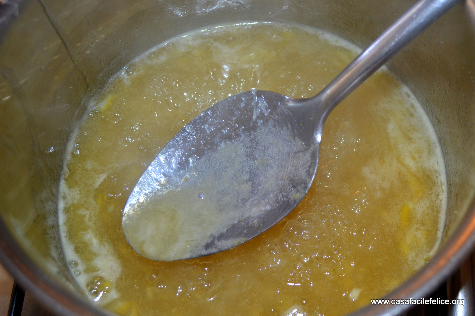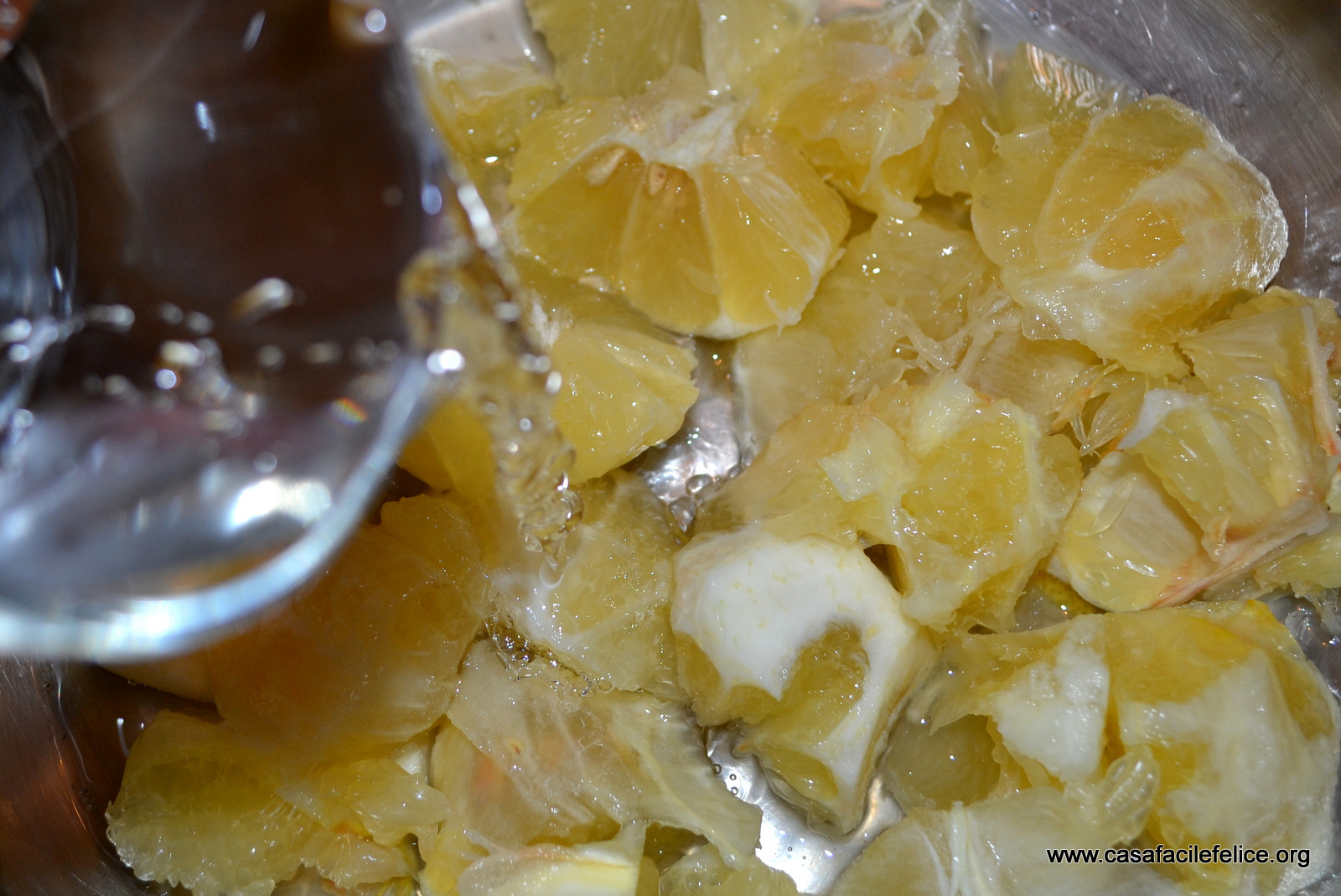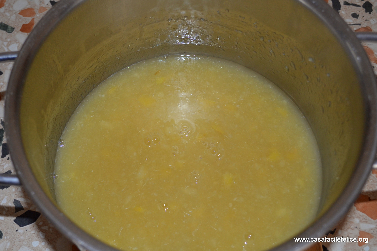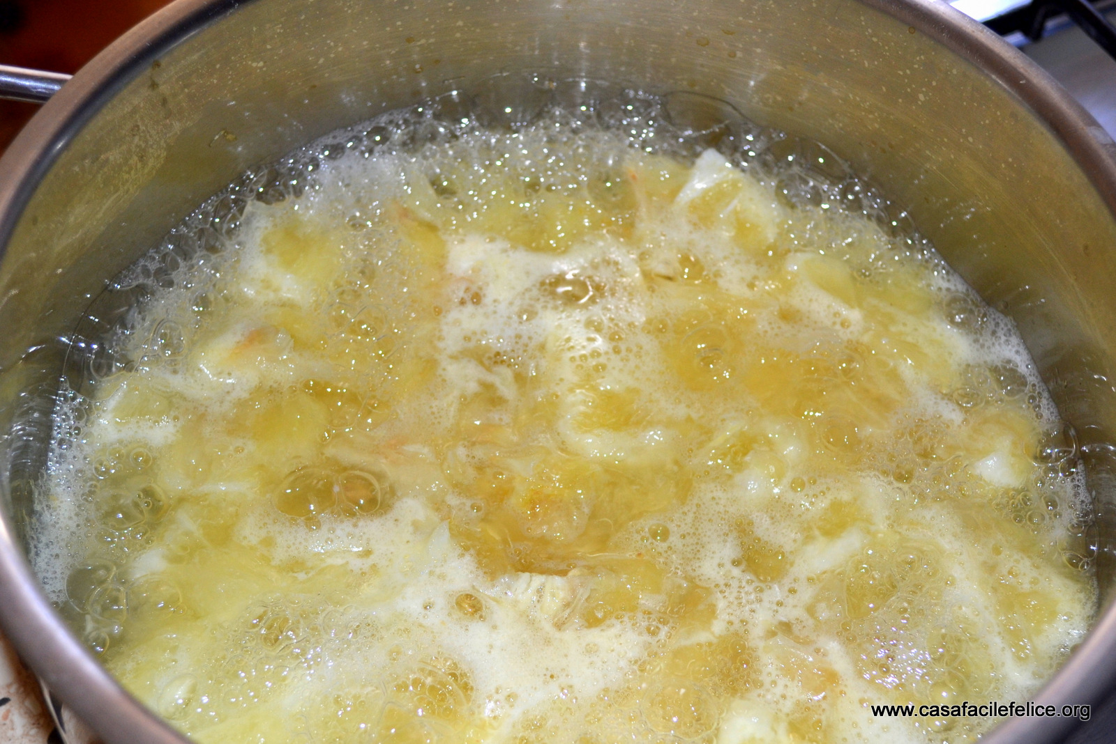 Tagliate a vivo i limoni che avete sbucciato, riduceteli a pezzetti, aggiungete tanta acqua quanta ne basta a ricoprirli e lasciate cuocere per qualche minuto, in modo che si ammorbidiscano.