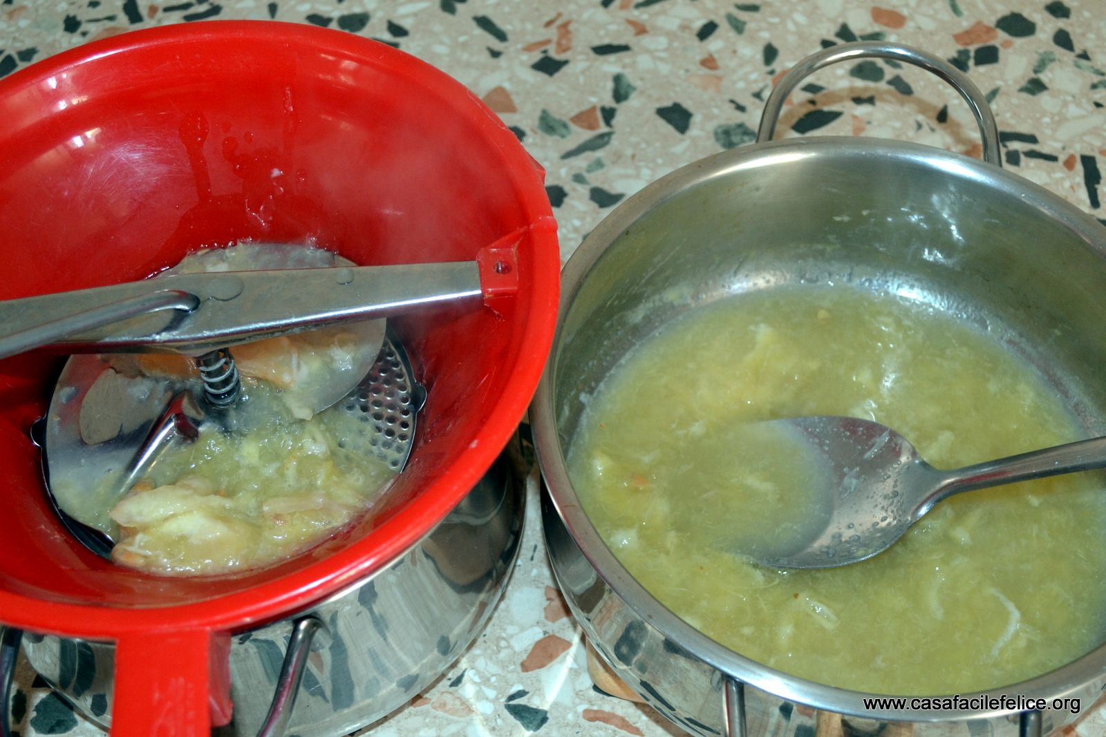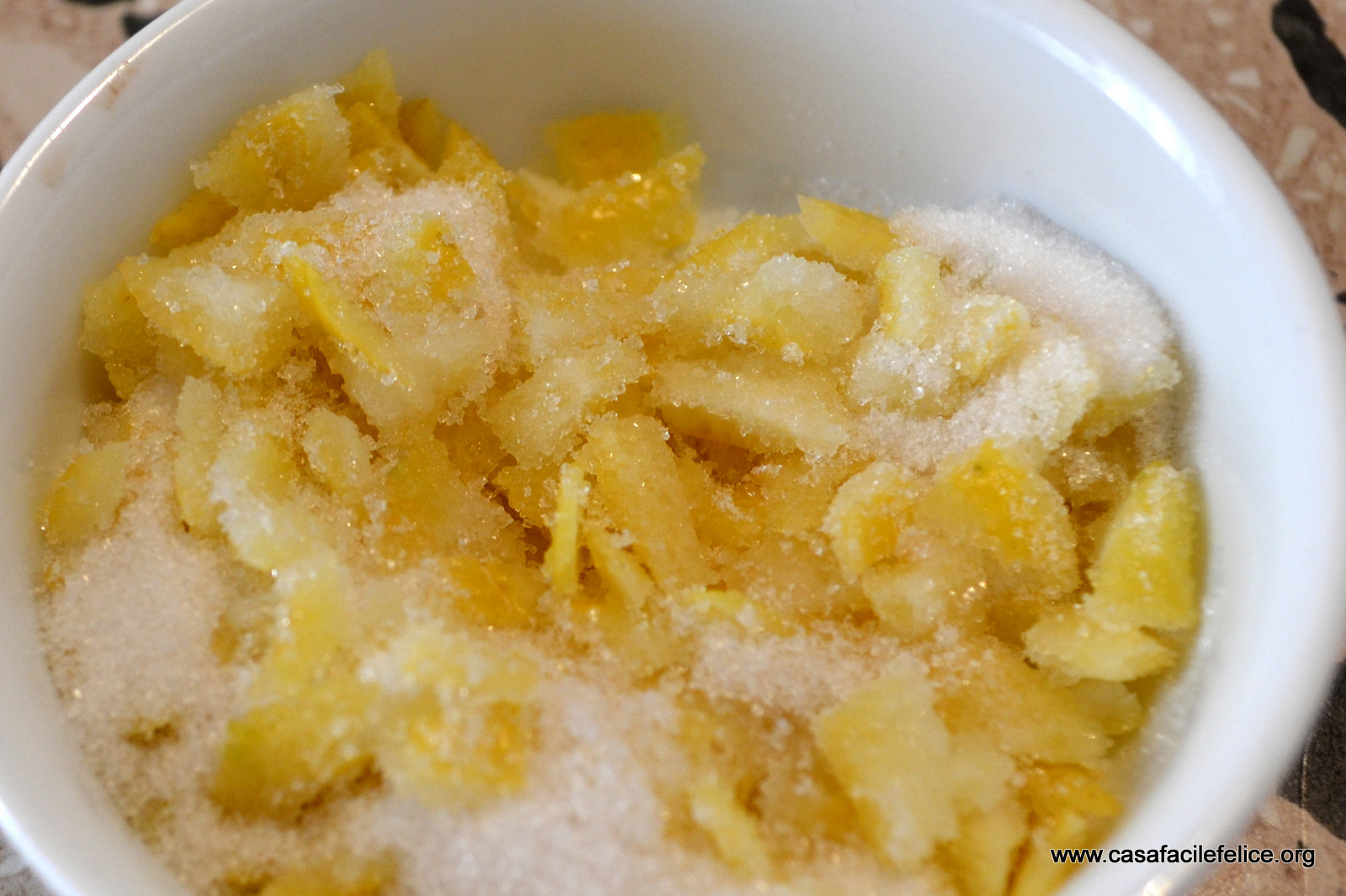 Passate nel passa-verdure la polpa dei limoni, mescolate accuratamente la purea ottenuta e quando sono pronte, aggiungete alla purea anche le bucce caramellate.
