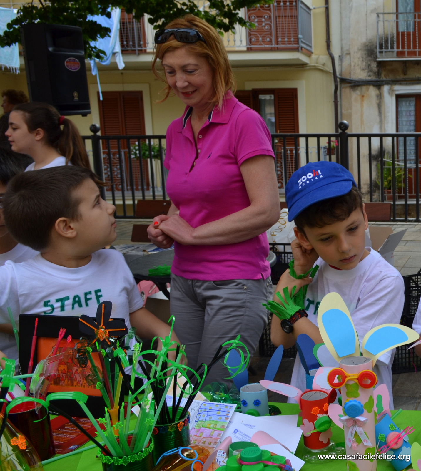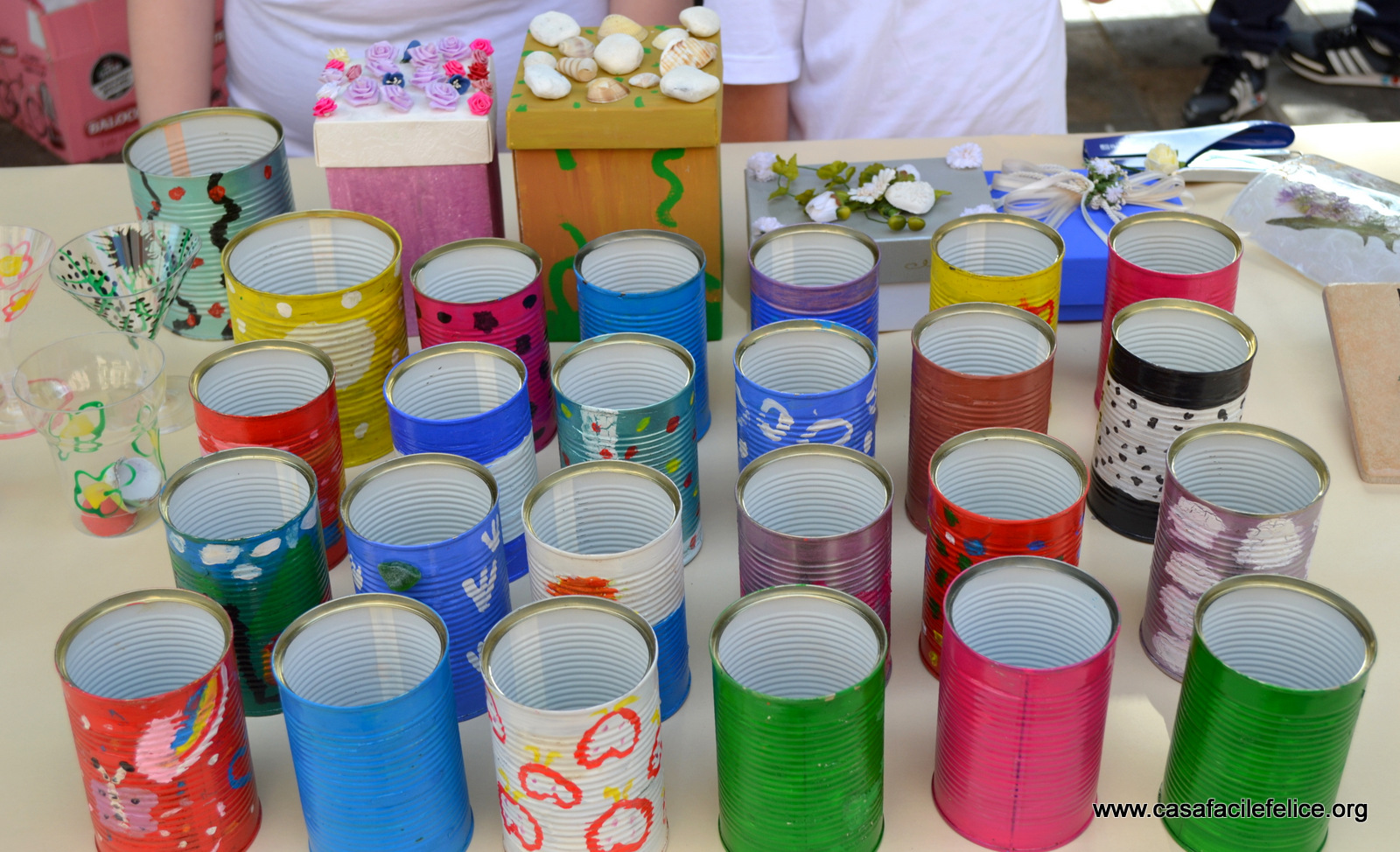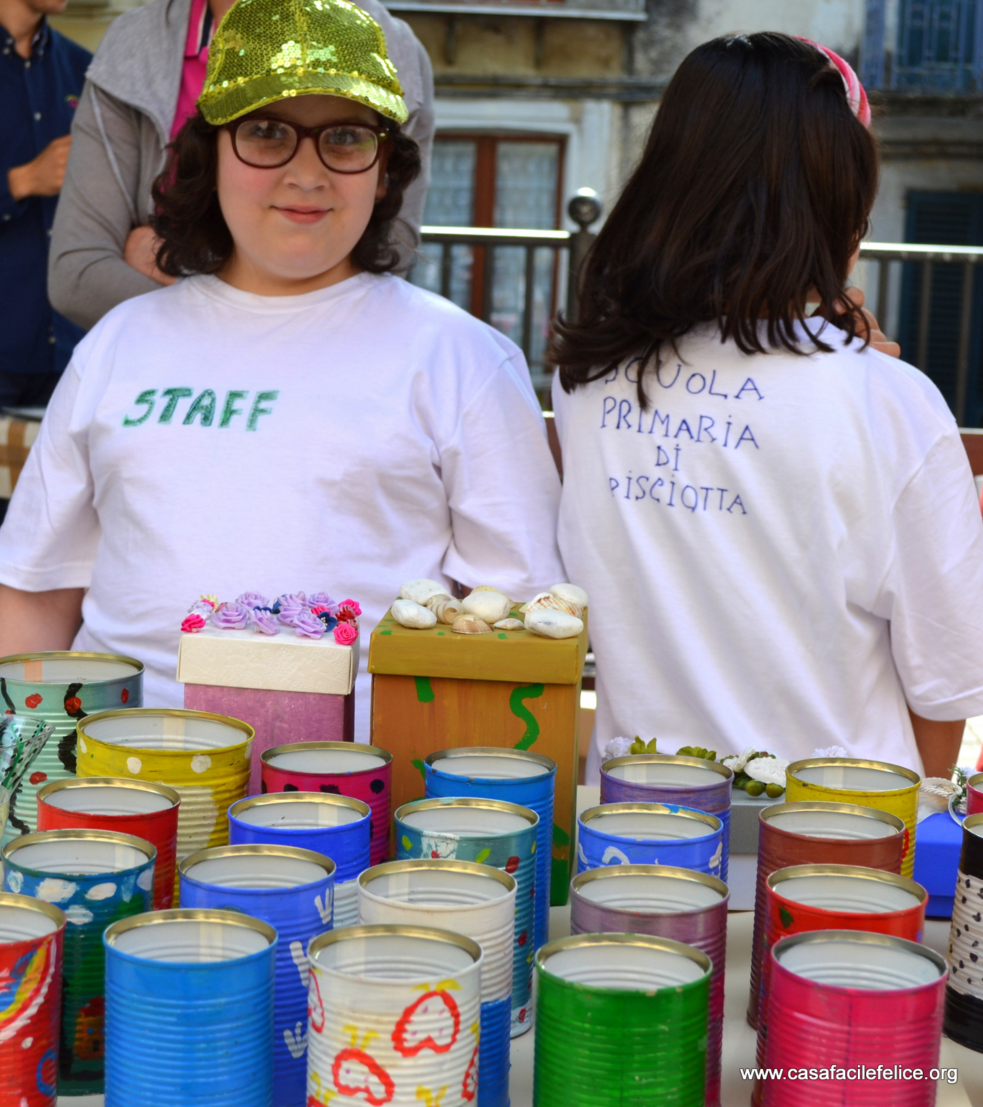 Oltre a ricerche storiche, erano in bella mostra alberi di Natale fatti con tappi di bottiglie di plastica, bicchieri trasparenti colorati a mano e barattoli di latta, grandi e piccoli, finemente decorati; contenitori allegramente colorati, di cartoncino o di plastica, di varie misure, per penne e matite; braccialetti e piccoli fiori di porcellana, conchiglie e borsettine di paglia; piastrelle decorate, da appendere alle pareti o da usare come sottopentola; piatti colorati e variamente decorati, da utilizzare come centrotavola o in tanti modi diversi.festa del riciclo