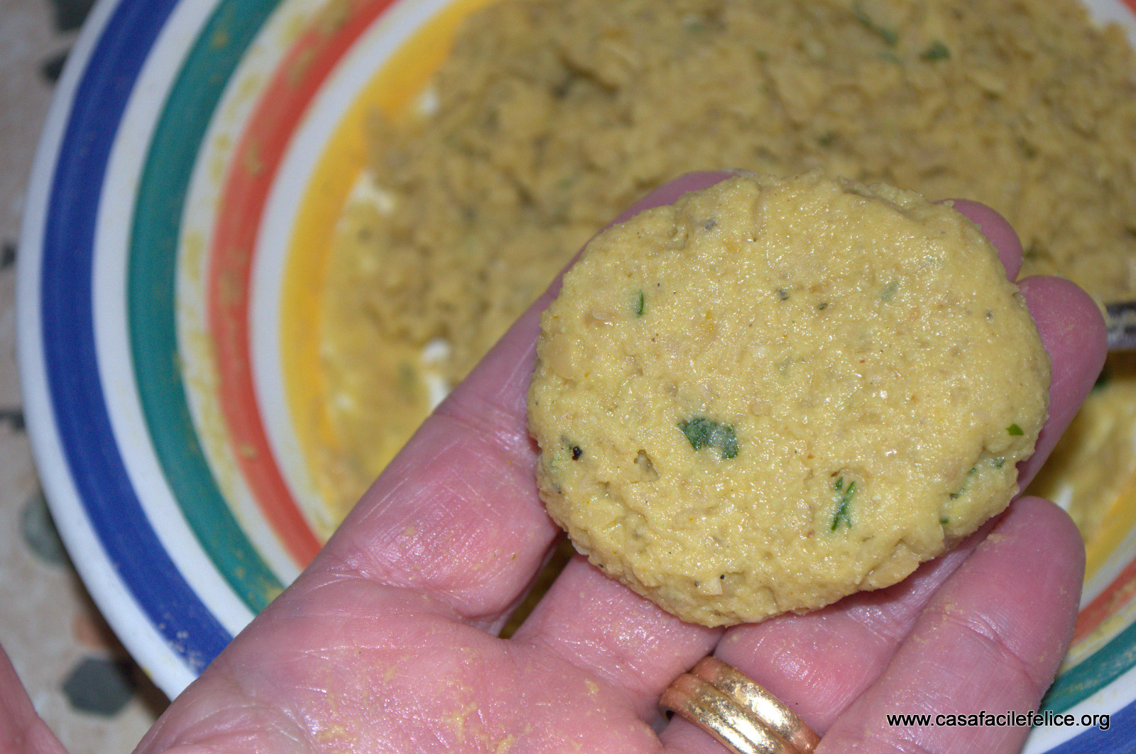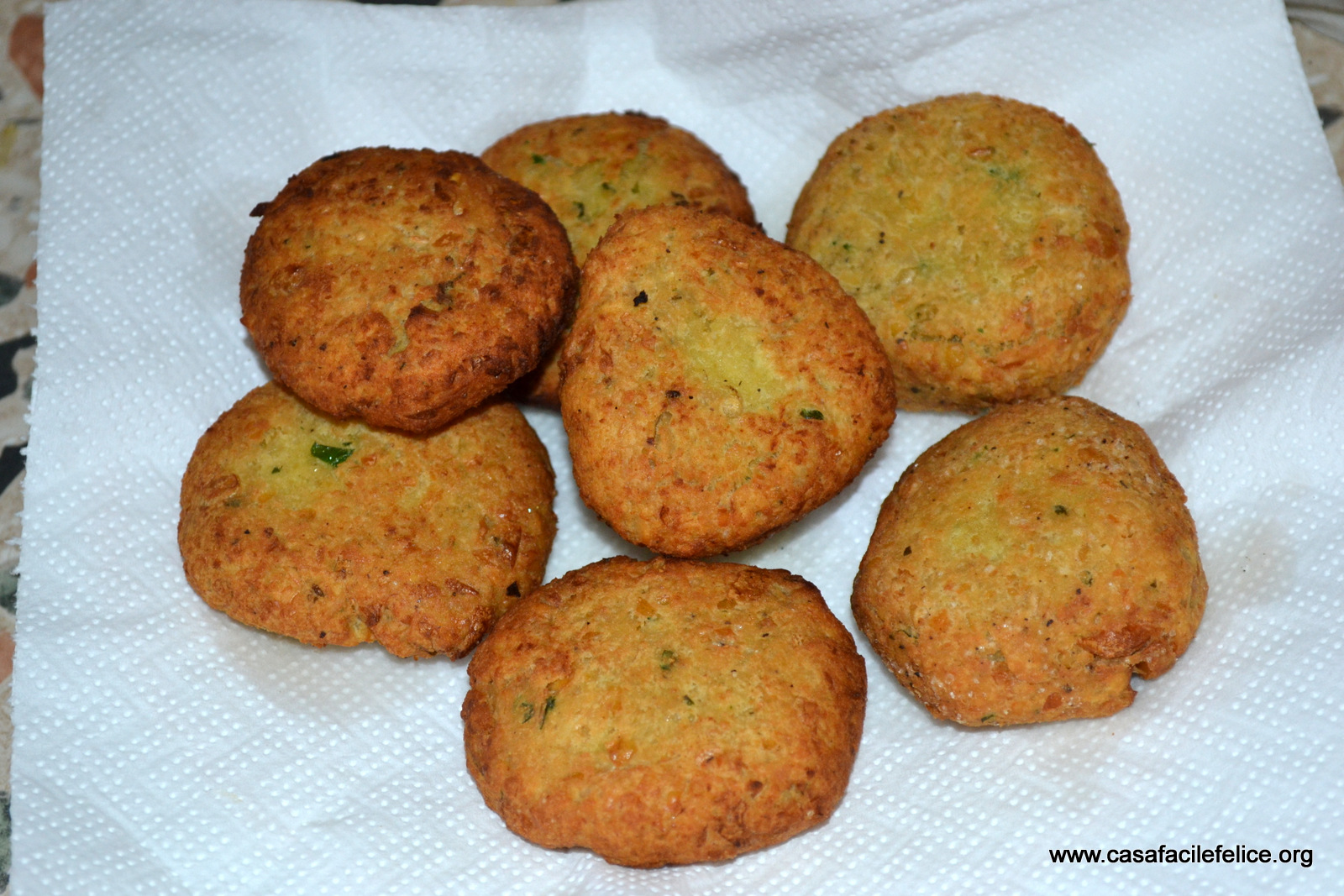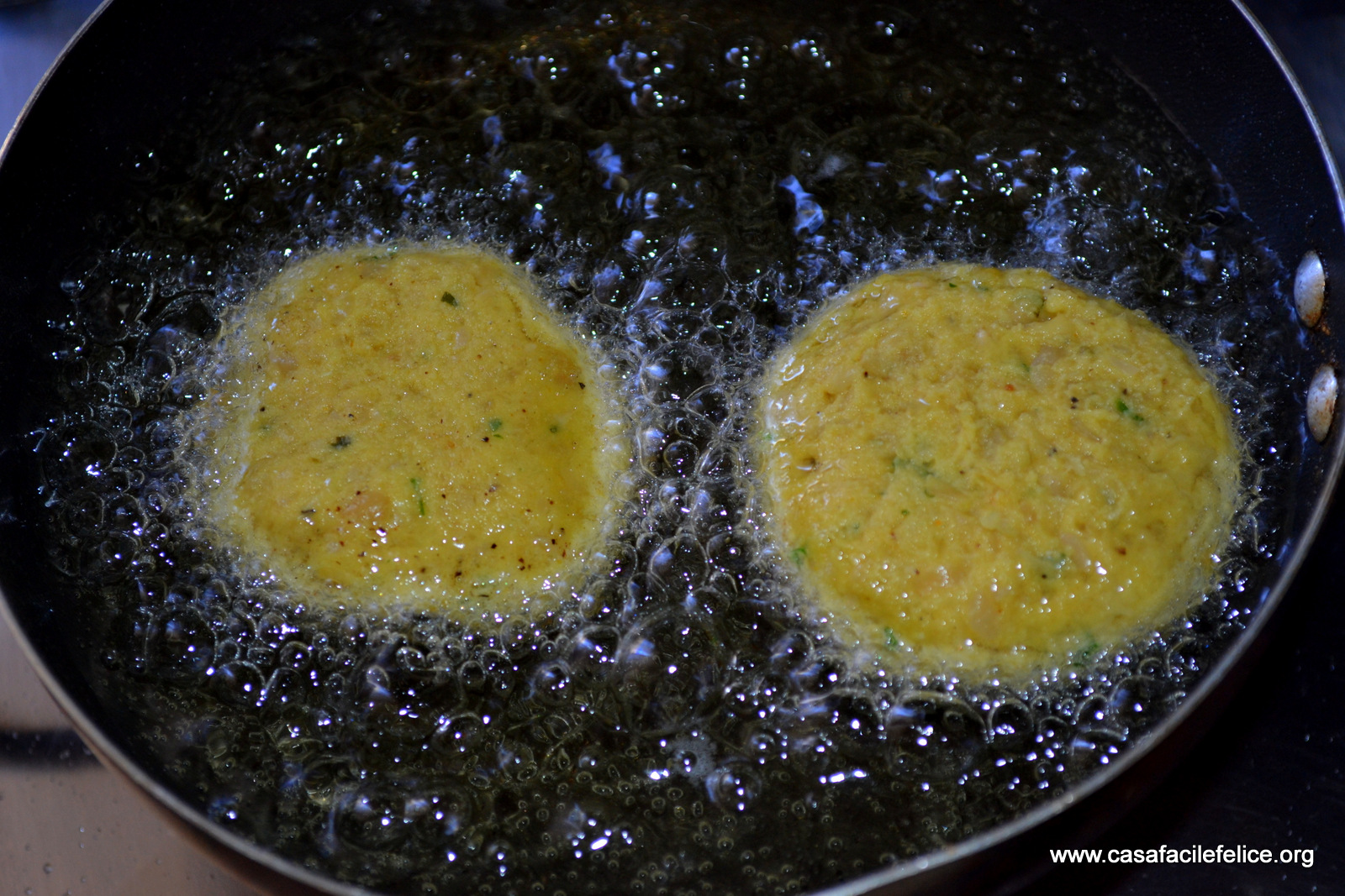 Con le dita, formate delle polpettine leggermente schiacciate e friggetele in olio caldo, ma non fumante.
