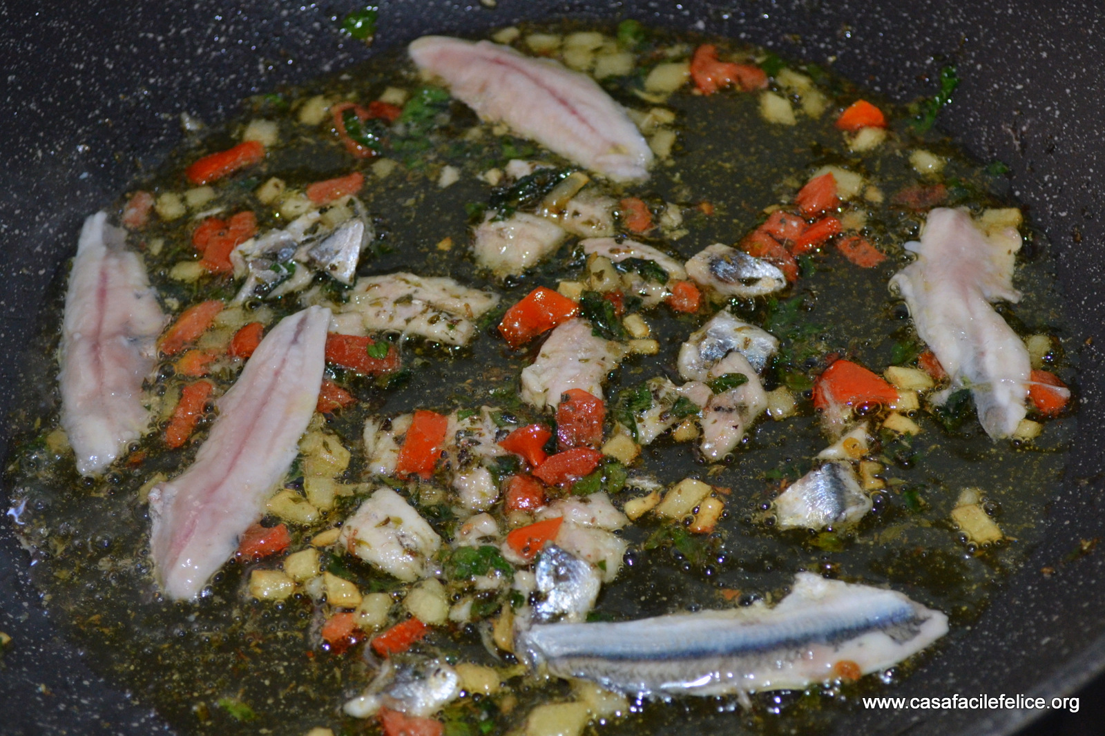 Deliscate le alici come descritto in questo video. Cuocete la pasta in acqua bollente salata e tenete conto che dovete scolarla 2 minuti prima della cottura; nello stesso momento, mettete sul fuoco una padella capiente e fate profumare l’olio con gli aromi tritati, a fuoco dolce.