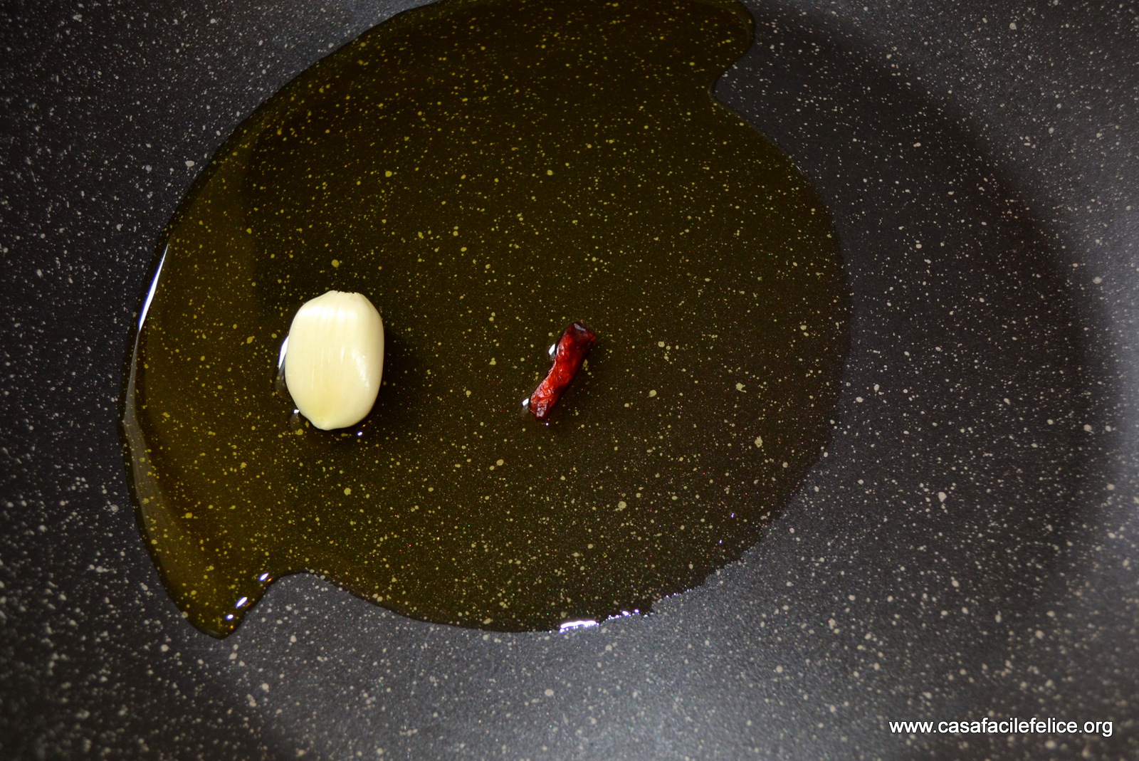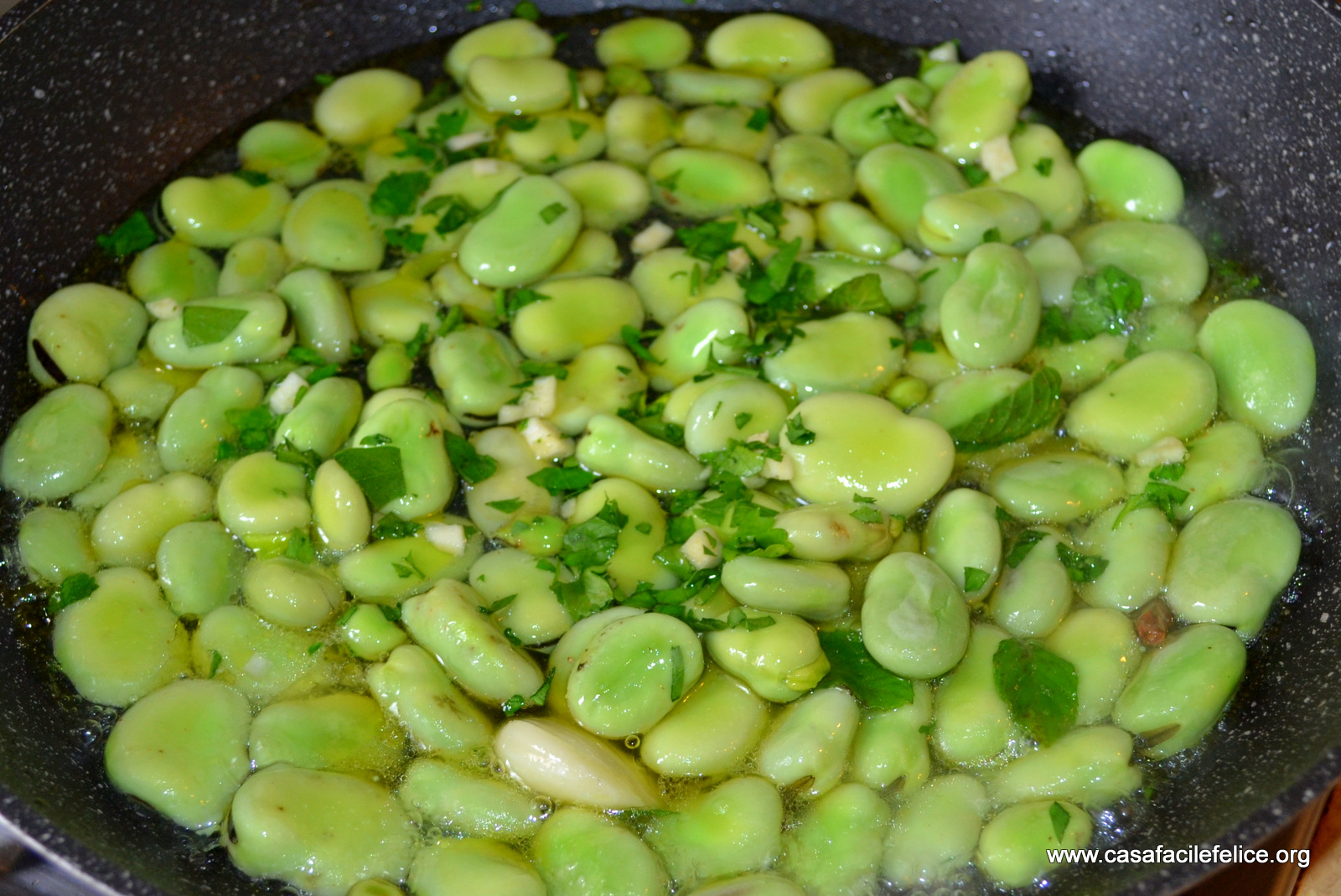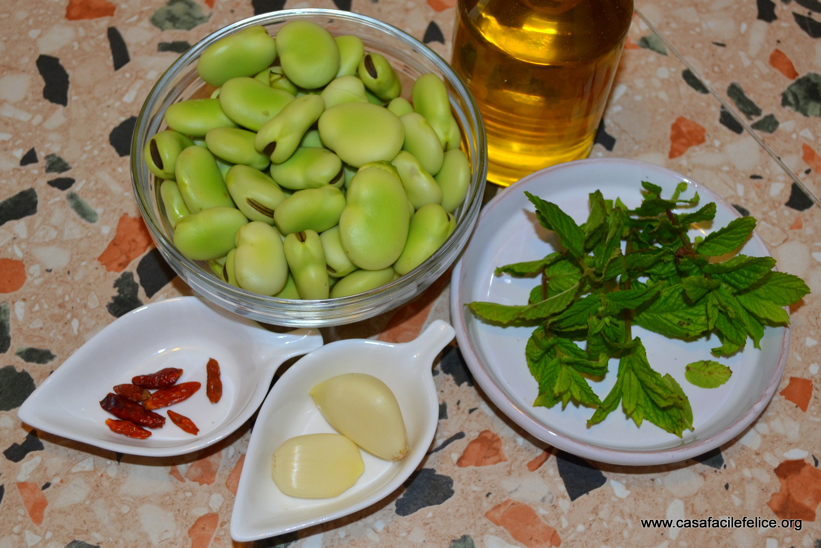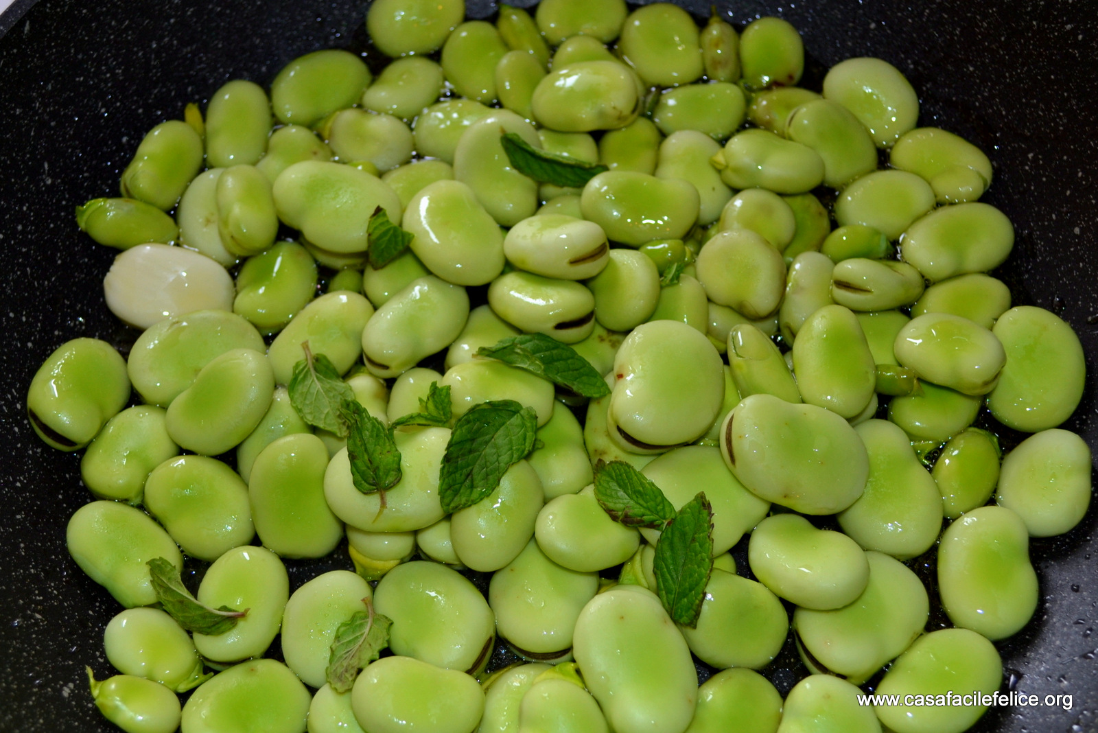 Sgusciate e lavate le fave; fate profumare l’olio con lo spicchio di aglio e il peperoncino (usate una padella che possa accogliere anche le tagliatelle); versate le fave e aggiungete anche la menta (a piacere, potete mettere l’aglio e la menta tritati finemente).