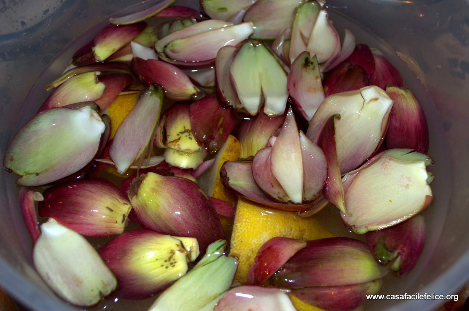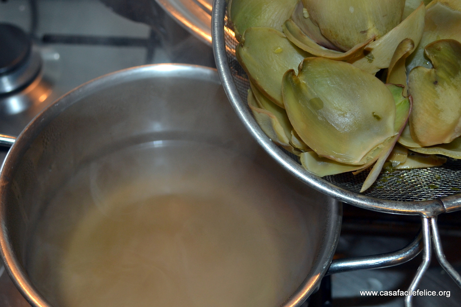 Lasciate le foglie esterne dei carciofini nell’acqua, acidulata con succo di limone, per 10 minuti; trascorso il tempo, scolatele, mettetele in una pentola con 250 ml di acqua e fatele bollire dolcemente per 10 minuti.