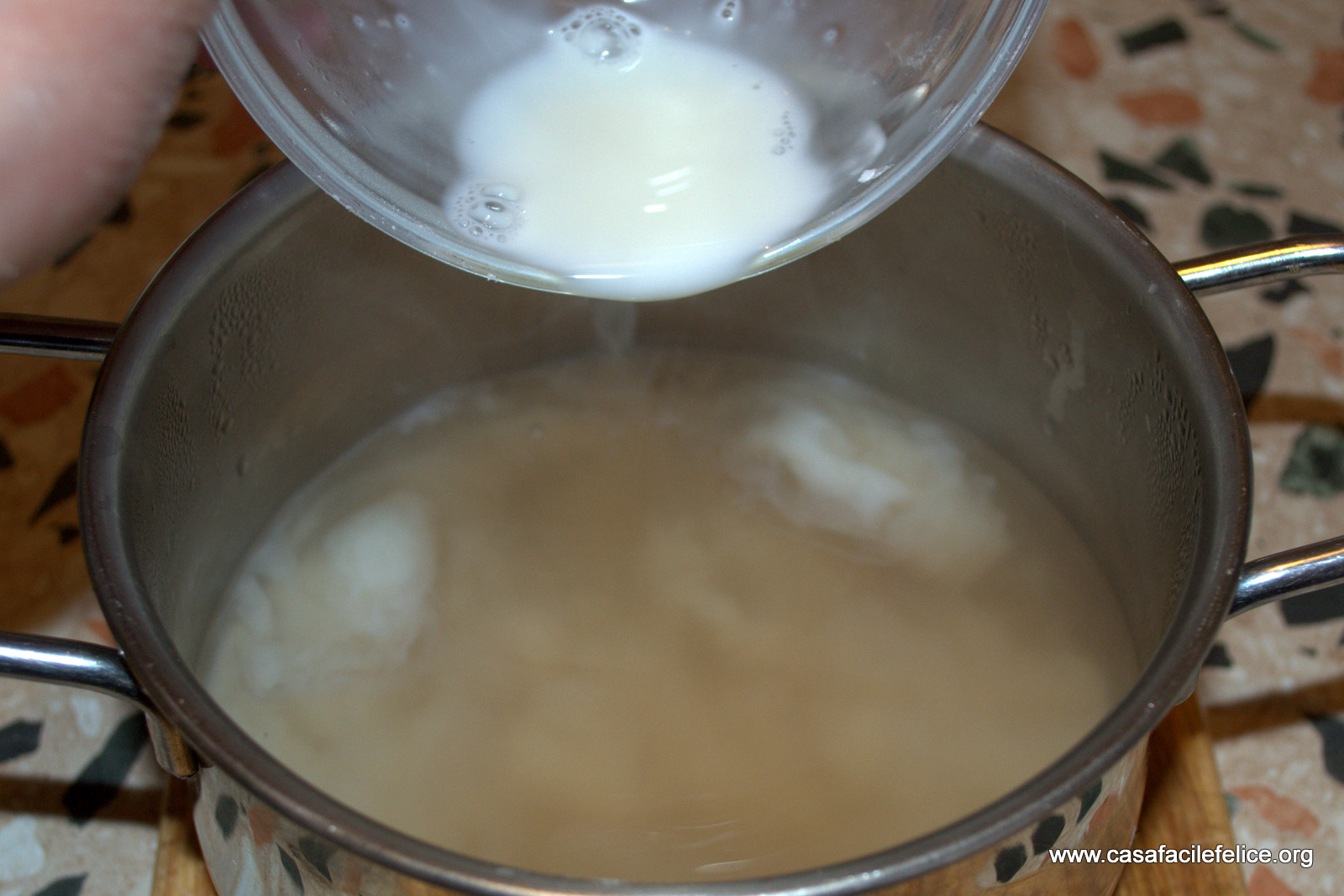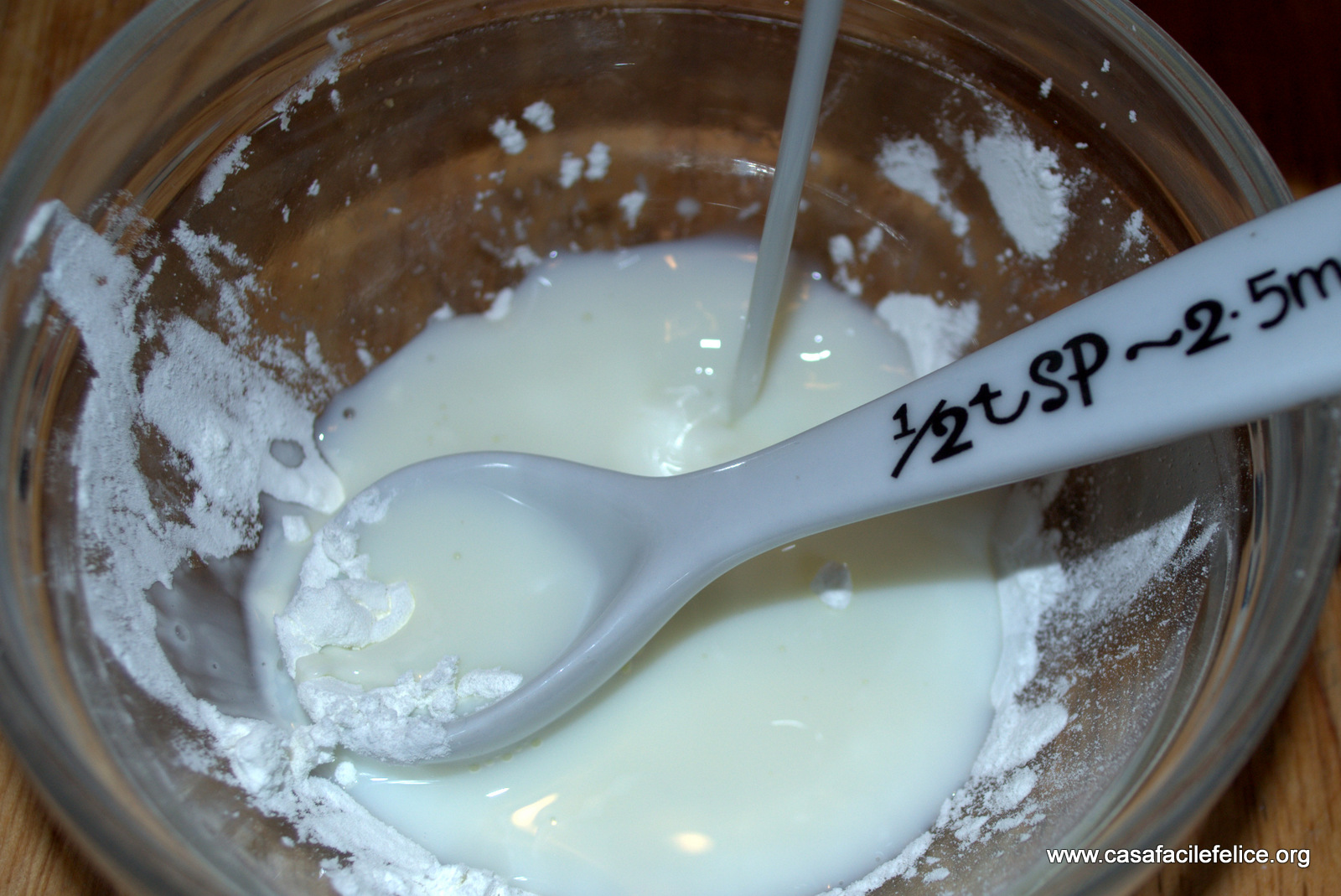 Filtrate il brodo di foglie di carciofini e lasciate intiepidire; in una ciotolina, sciogliete l’amido di mais con il latte (se volete, potete usare anche la farina),