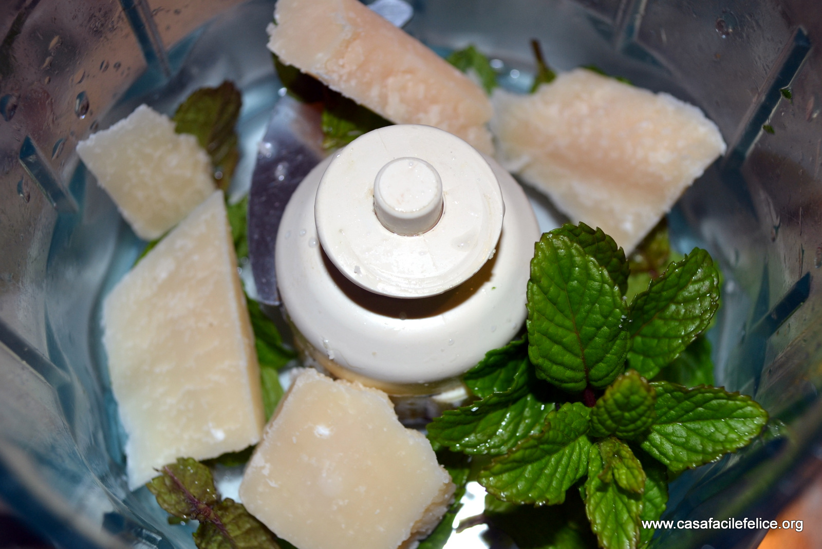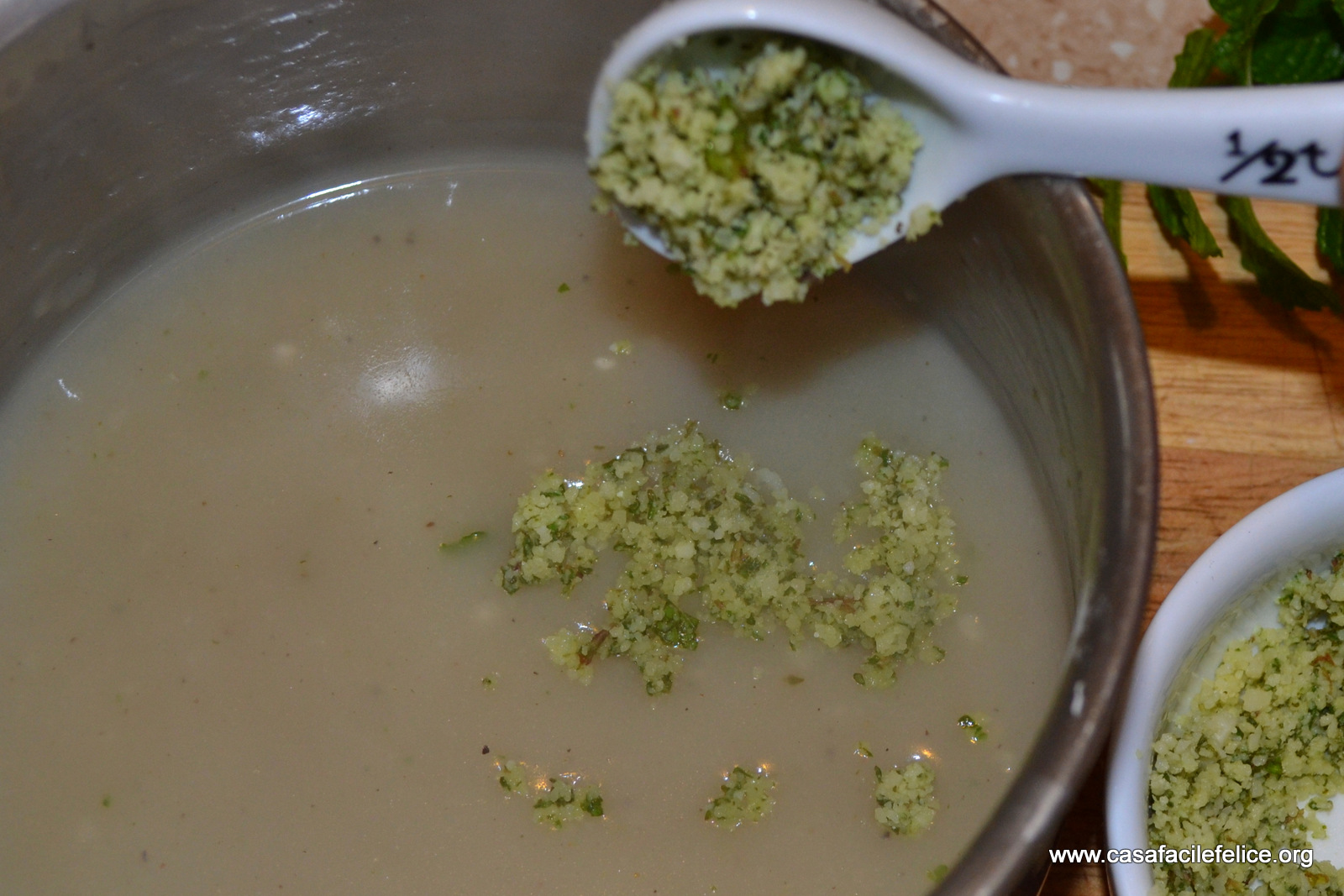 aggiungete il liquido al brodo filtrato, mettete sul fuoco dolce e lasciate cuocere, fino ad ottenere una crema fluida e densa, mescolando continuamente. Intanto, tritate 15 foglie di menta con il formaggio;