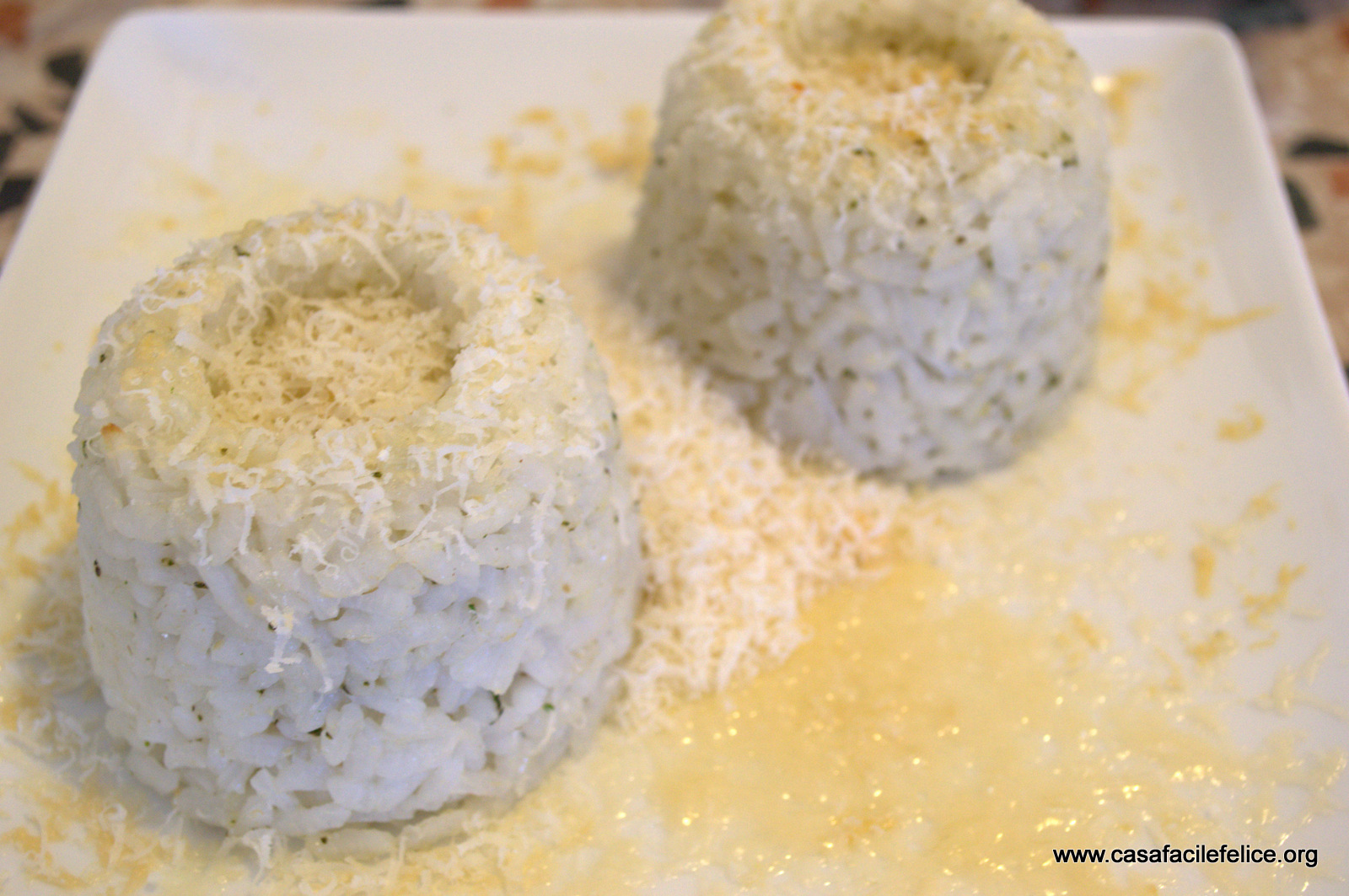 unite il trito alla blanquette, salate leggermente e pepate. Condite il riso con un po di crema e mettetelo nelle formine per timballi;