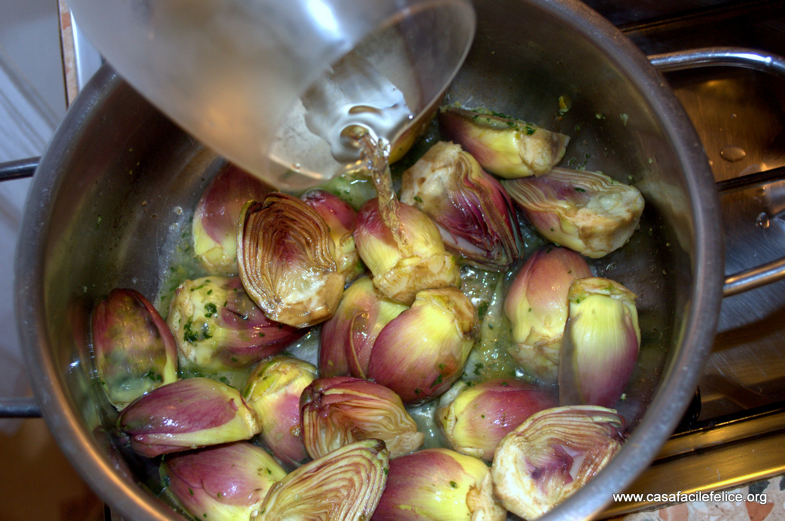 In una padella, rosolate leggermente i carciofini nell’olio con metà degli aromi tritati, sfumate con il vino bianco e fate cuocere per 3 – 4 minuti.