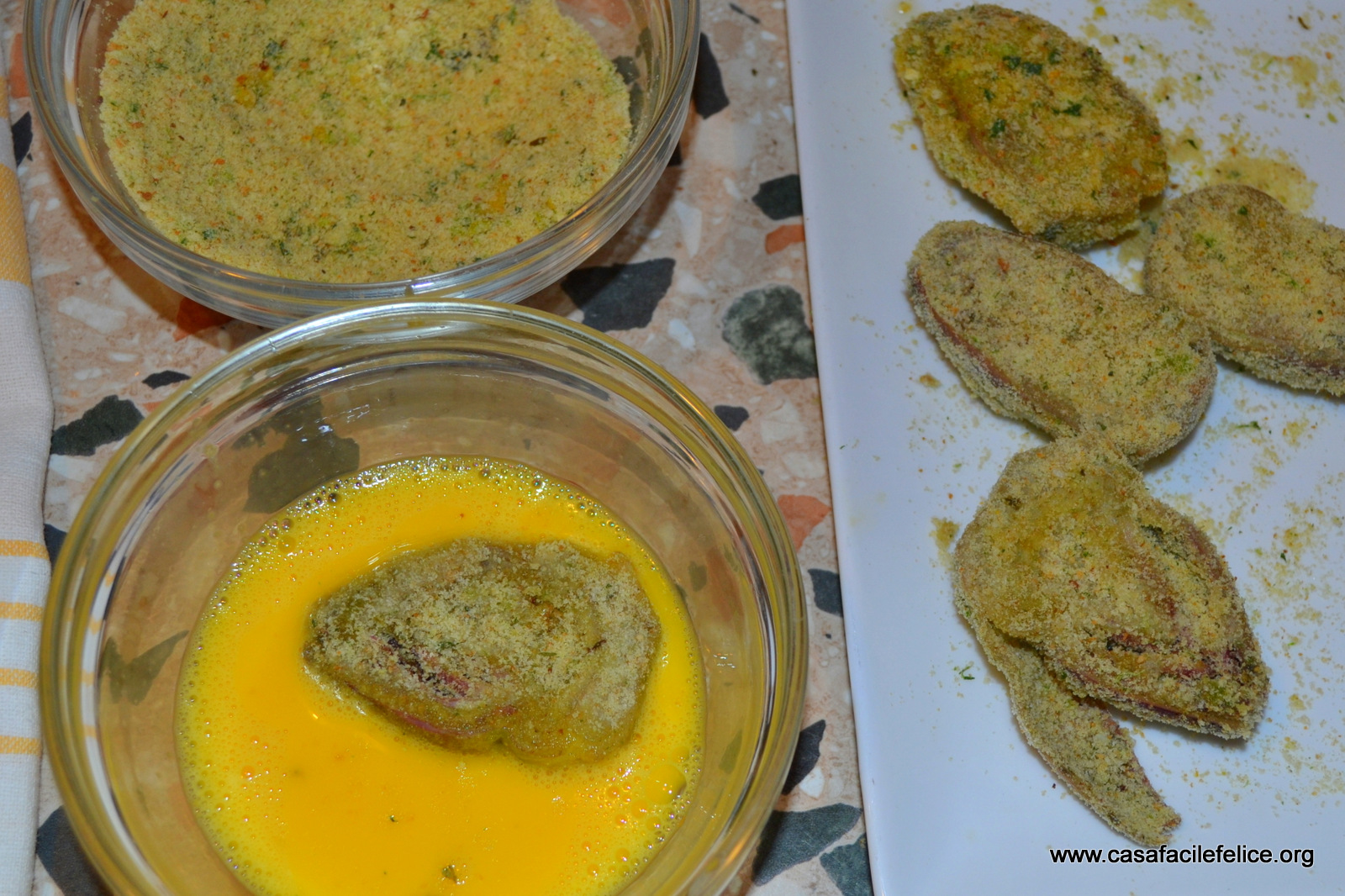 Passate i carciofini nel pane grattugiato, nell’uovo poi ancora nel pane grattugiato. Friggete in olio caldo ma non fumante, rivoltando un paio di volte.