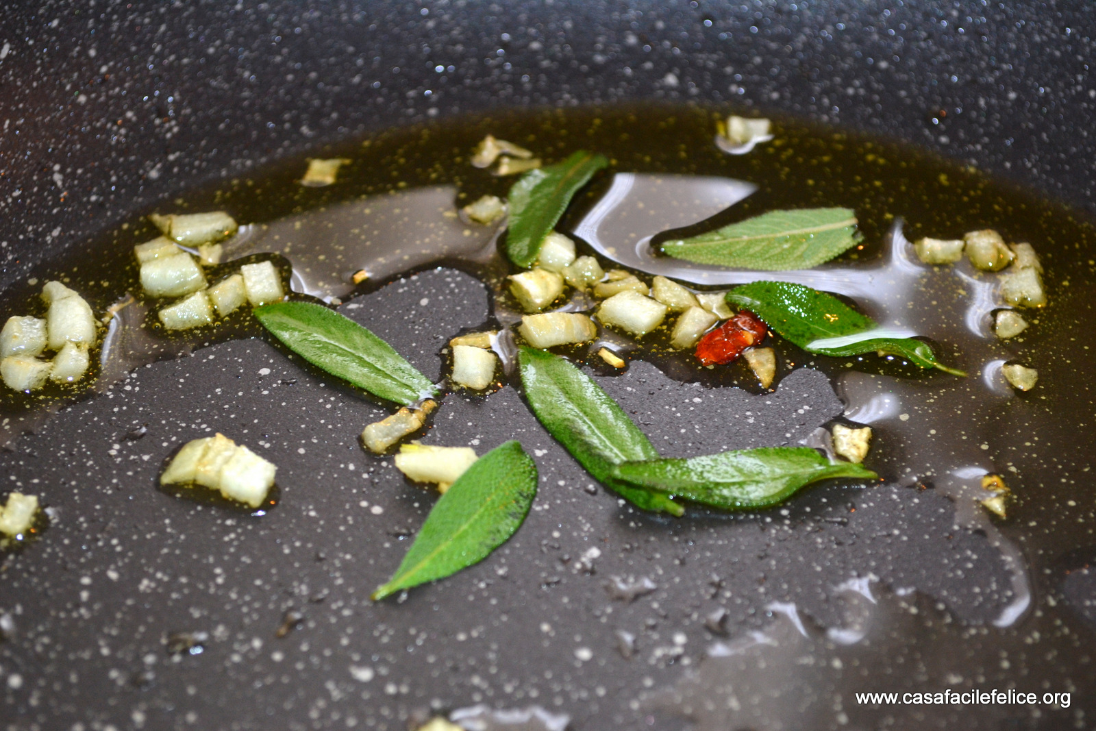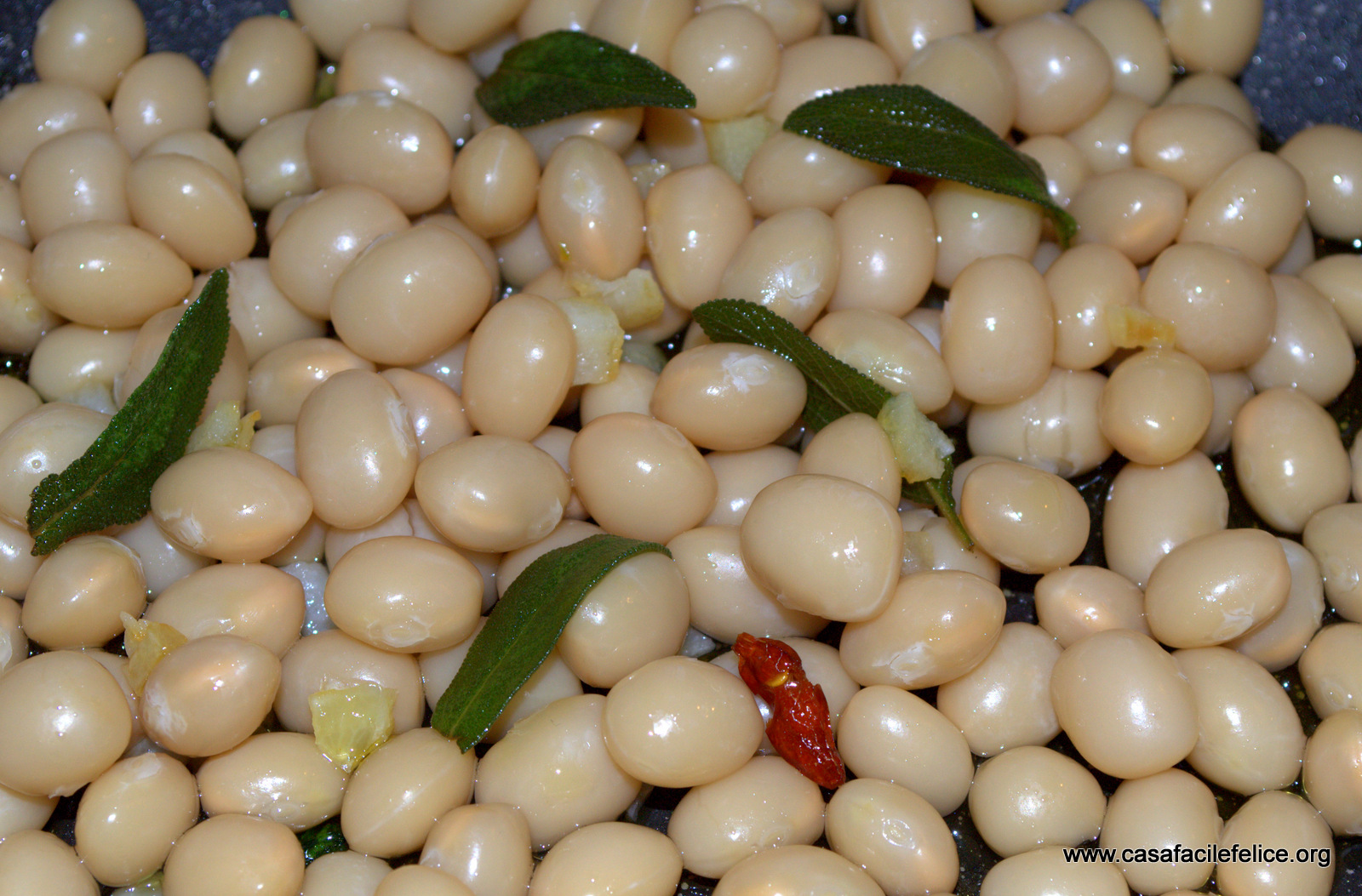 Preparate il soffritto, scaldando l’olio in una padella al quale aggiungete l’aglio tagliato a pezzetti, il peperoncino e le foglie di salvia intere, se sono piccole. Aggiungete anche i fagioli, privati dell’acqua di cottura e lasciate amalgamare tutto, per qualche minuto.