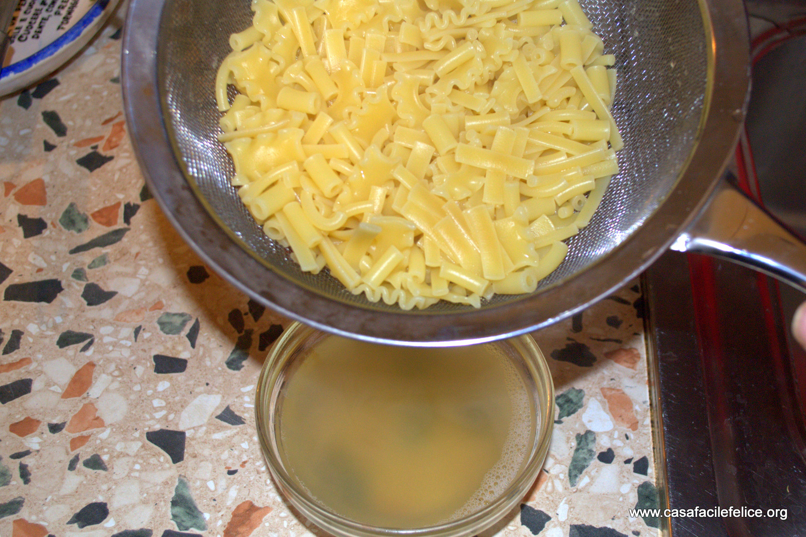 Cuocete la pasta e scolatela piuttosto al dente, conservando un mestolo di acqua di cottura.