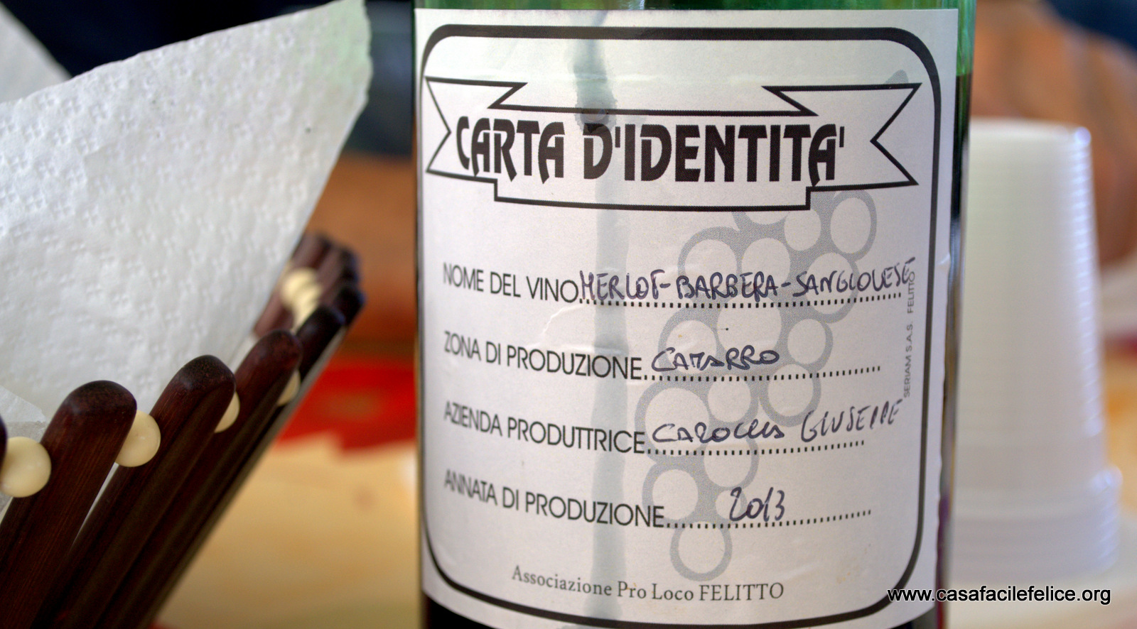 Viene servito anche vino rosso delle cantine locali, che ha gusto mediamente persistente, morbido al palato con sentori di fichi e pesche.