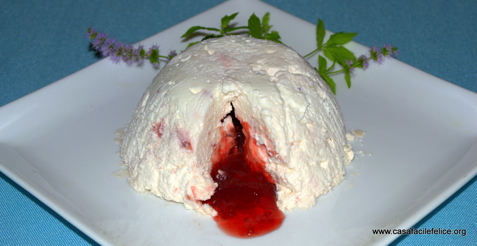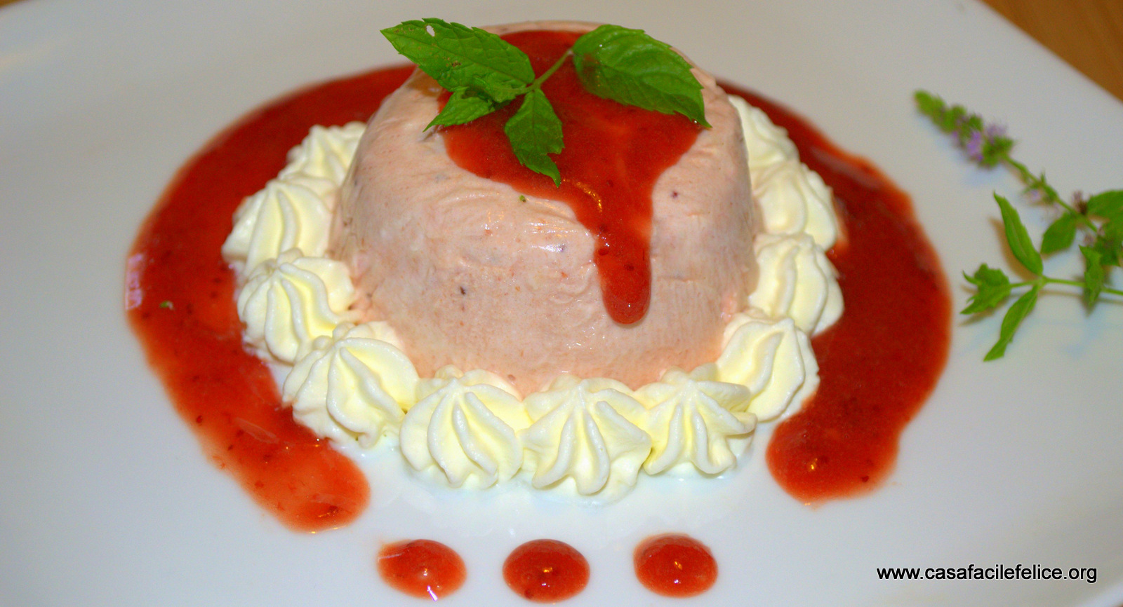 Tenete da parte 50 grammi di panna per decorare la mousse con ciuffetti, una volta capovolta sul piatto e usate rametti fioriti di menta.