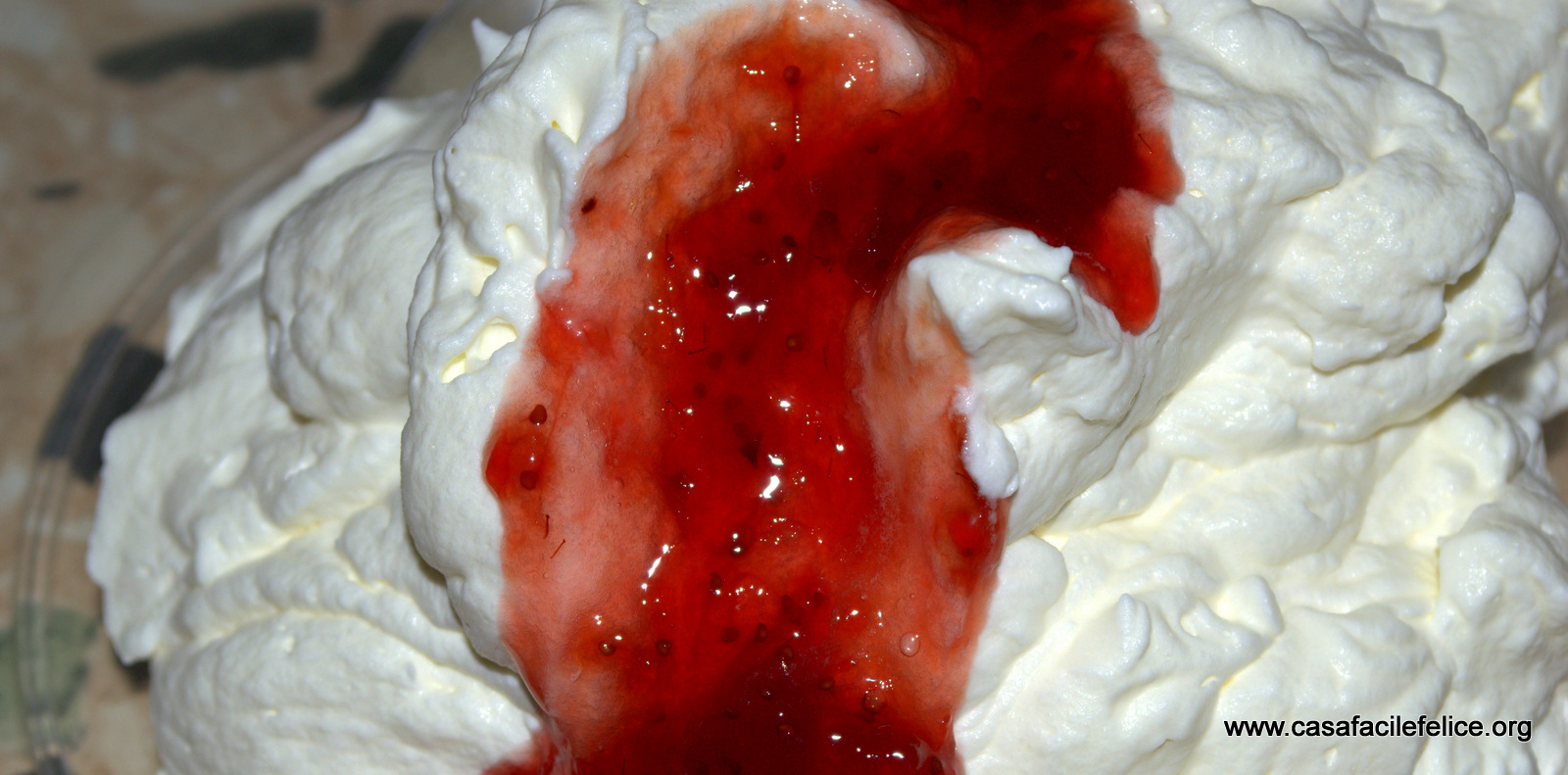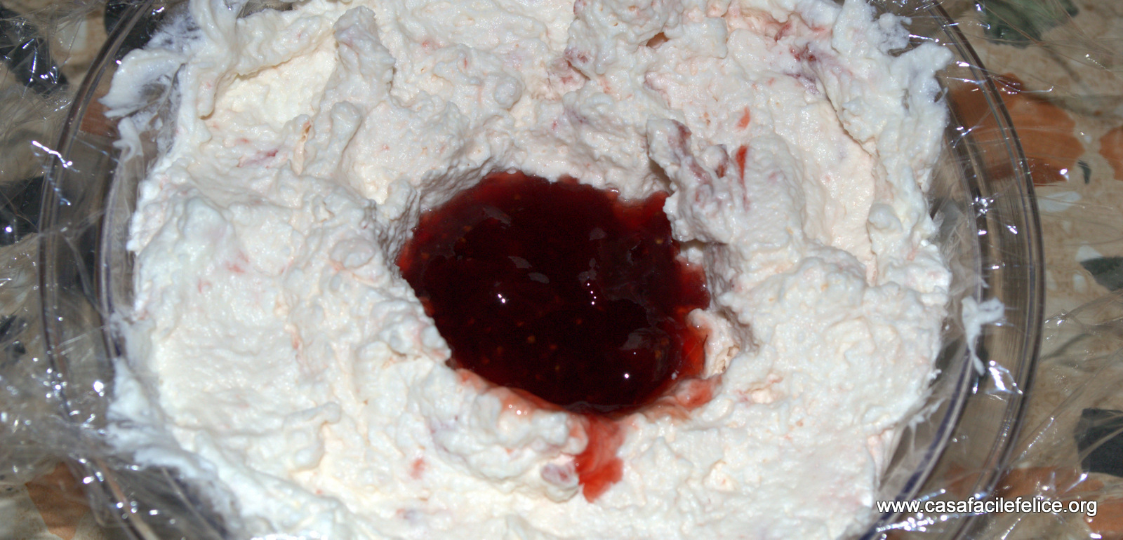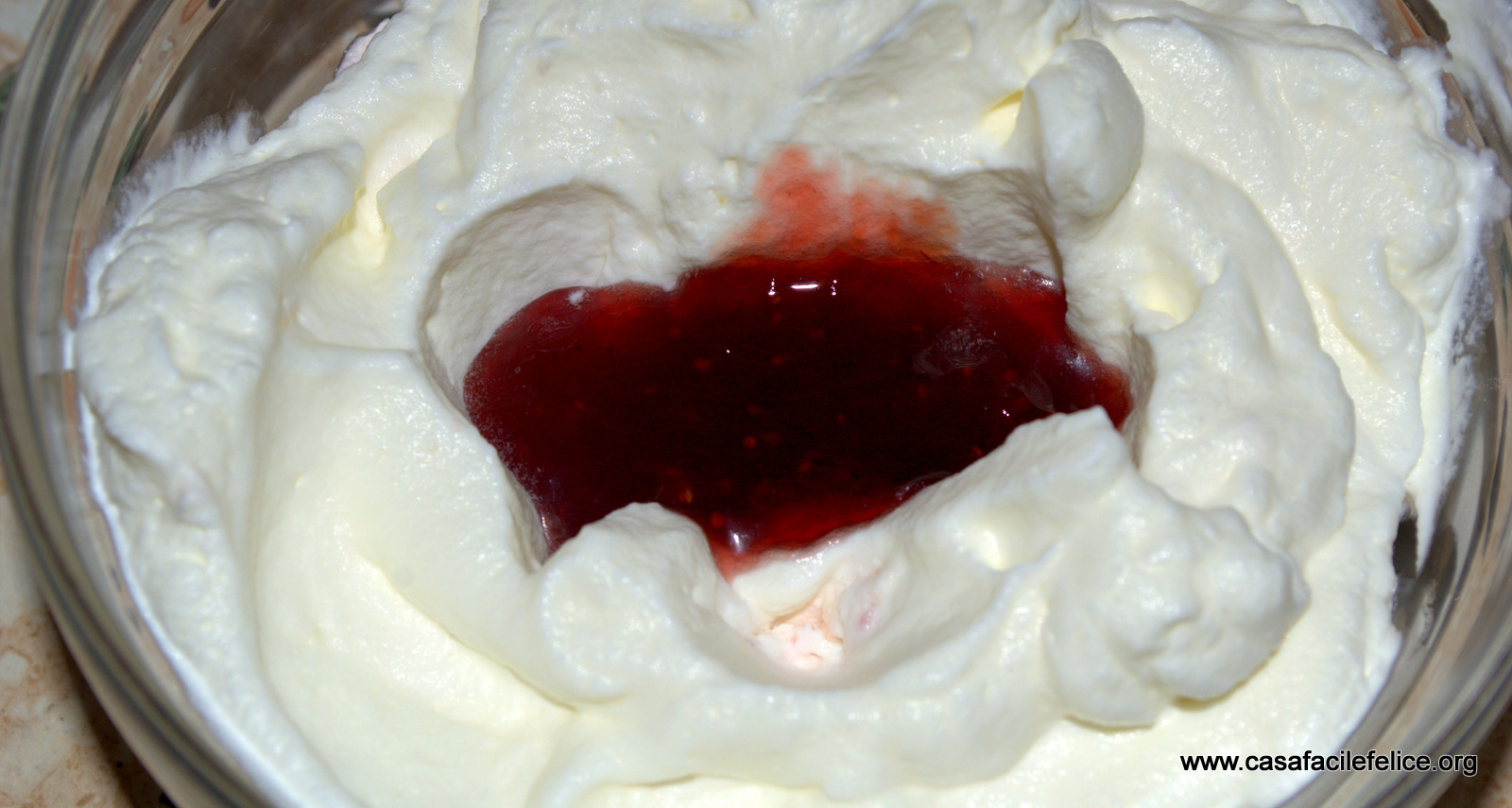 Montate la panna, aggiungete 100 grammi di marmellata e mescolate.