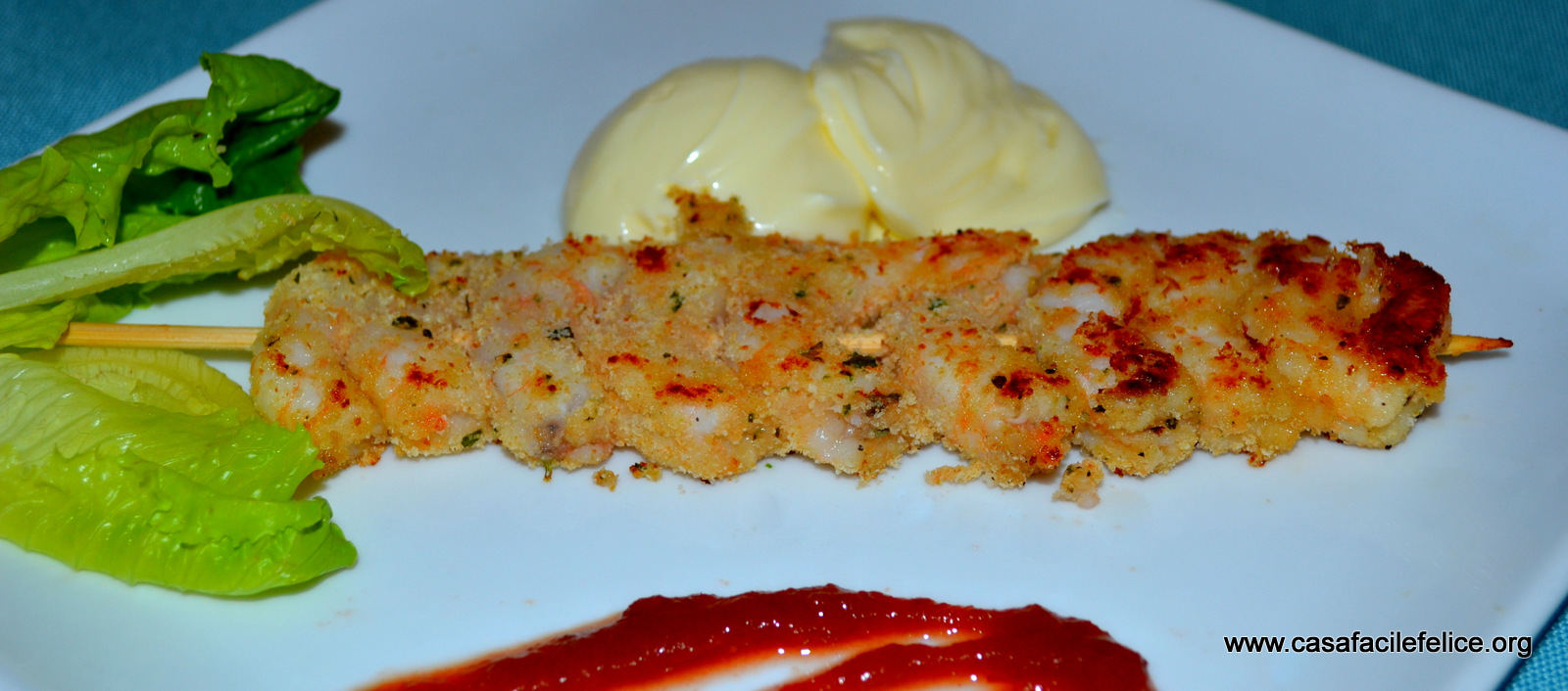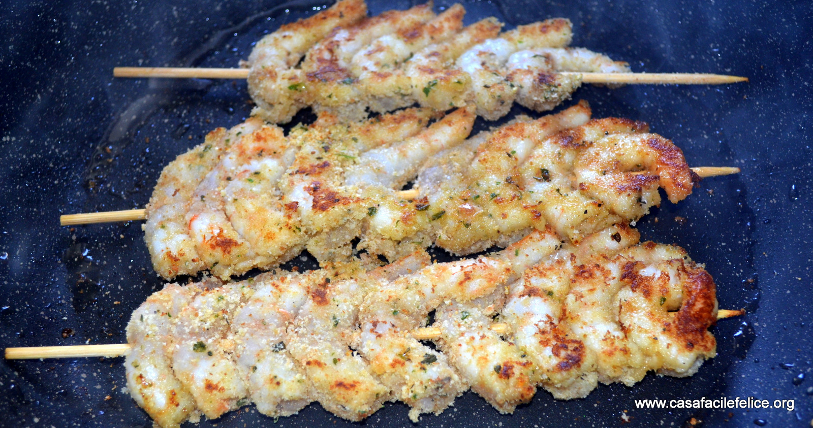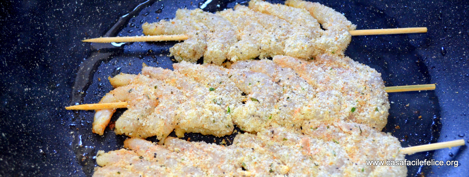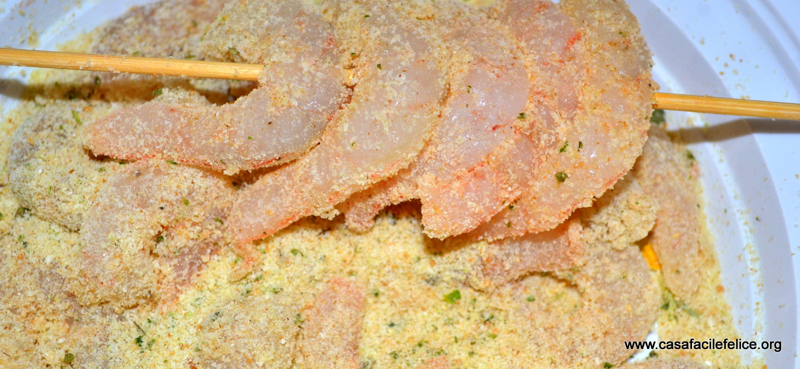 Passate i gamberetti nel pane condito, in modo che ne siano ricoperti completamente e infilzateli nello spiedino, come mostra la foto.