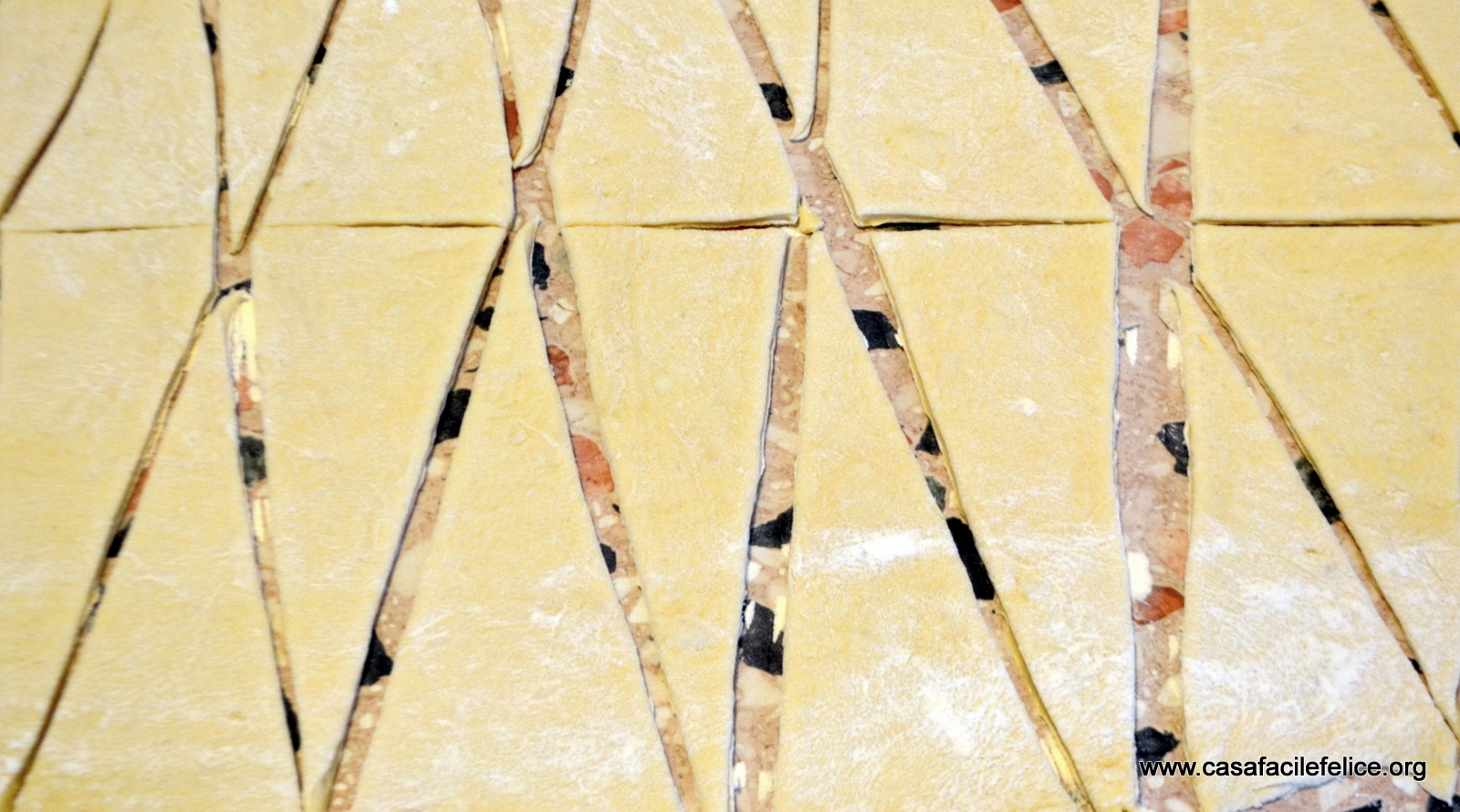 Tagliate la sfoglia in triangoli cornetti impasto base e arrotolateli come mostrato nelle foto cornetti impasto base (se volete farcirli, stendete un cucchiaino di marmellata prima di arrotolarli).cornetti impasto base