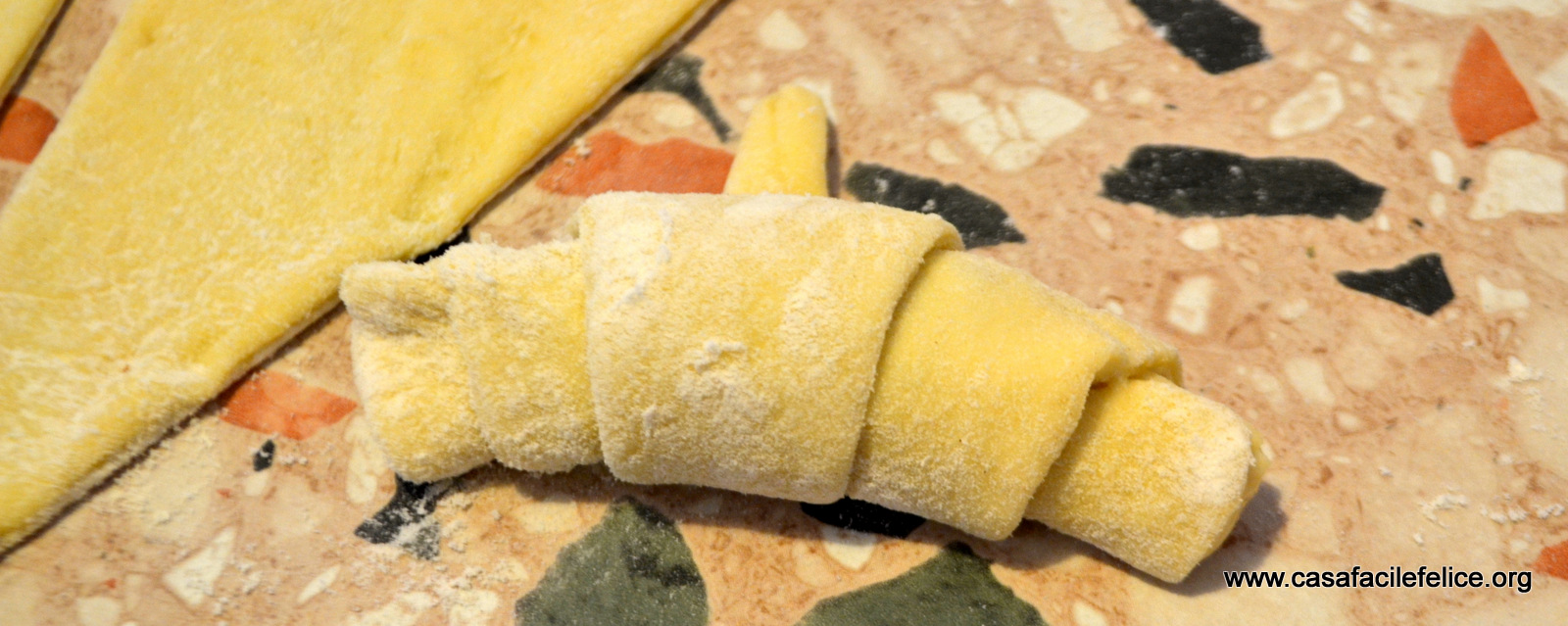 Trascorso il tempo, riprendete l’impasto, lasciatelo 20 – 30  minuti a temperatura ambiente poi stendete sul piano di lavoro e ripiegate a libro; lavorate con il mattarello fino ad ottenere una sfoglia sottile poco meno di 1 centimetro.cornetti impasto base