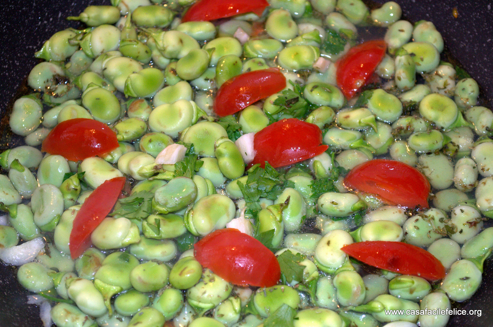 Sbucciate e lavate le fave, mettetele in padella con olio, origano, vino bianco e pomodorini, privati dei semi e tagliati a fettine, e fate cuocere per 10 minuti.