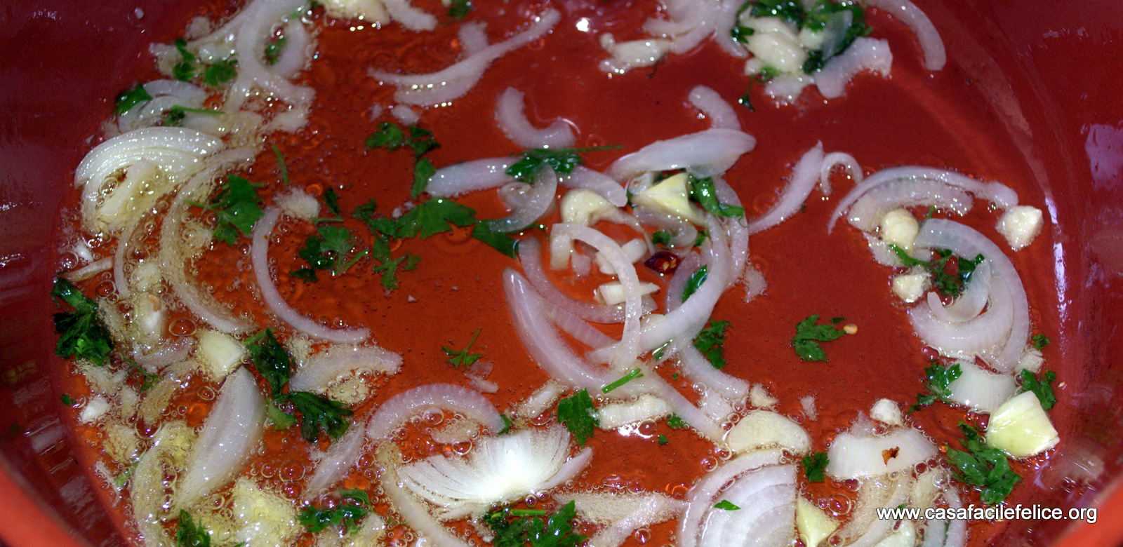 Preparate il sugo. Fate appassire la cipolla affettata, l’aglio tagliato a pezzetti e gli aromi nell’olio caldo per un paio di minuti.