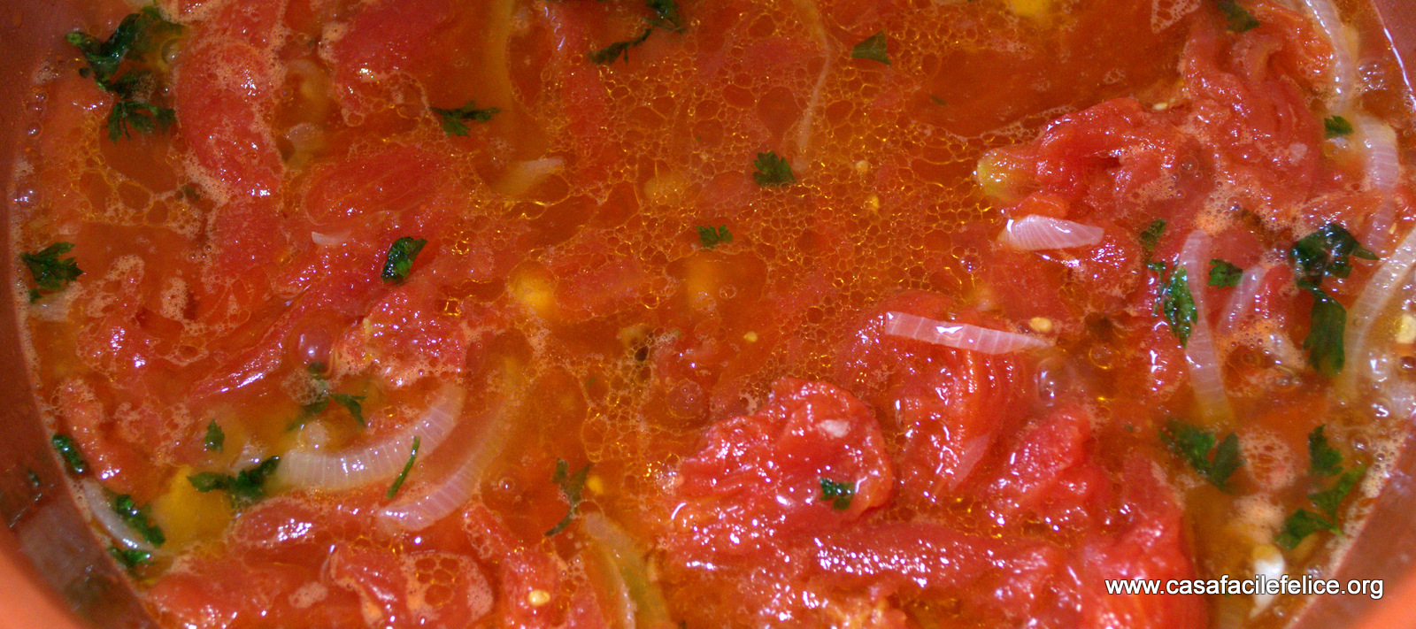 Aggiungete i pelati e fate cuocere altri 3 minuti.