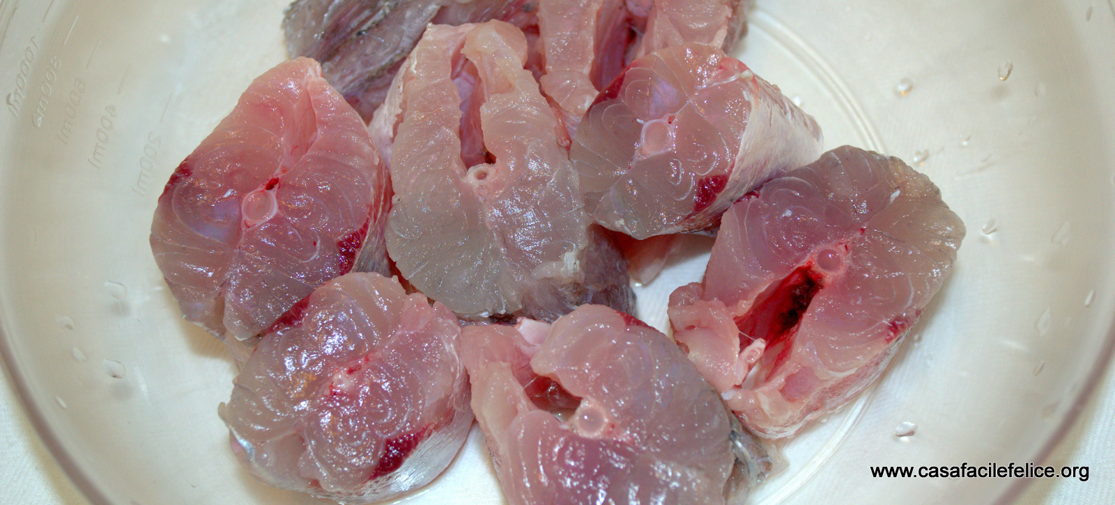 Tagliate il pesce in tranci di 2 o 3 centimetri di spessore, conditeli con un po di aromi e mettete in frigo.