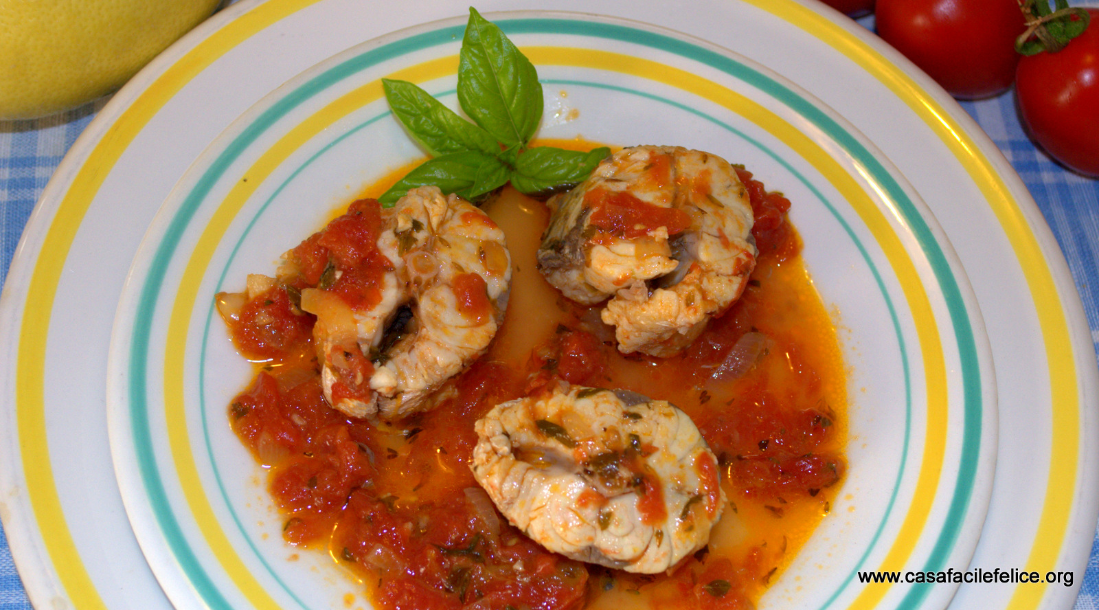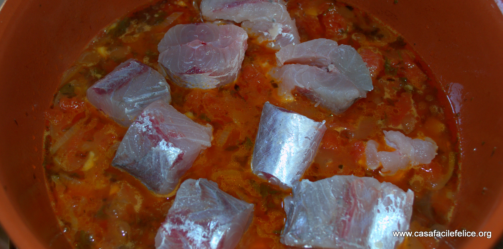 Quando il sugo bolle, unite i tranci di pesce e fate cuocere un minuto. Poi mescolate, spegnete il fuoco, coprite con il coperchio e aspettate 3 minuti prima di servire.