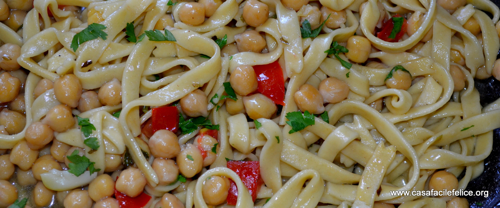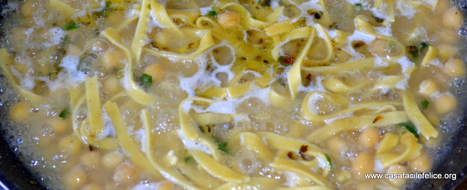 Per questa ricetta occorrono tagliatelle spesse fatte a mano; naturalmente anche quelle in vendita vanno bene. I ceci sono quelli secchi, messi a bagno la sera prima; anche questo può essere evitato comprando una confezione di ceci già cotti. Non dimenticate di eliminare l’acqua di governo, al suo posto potete usare acqua o brodo vegetale.