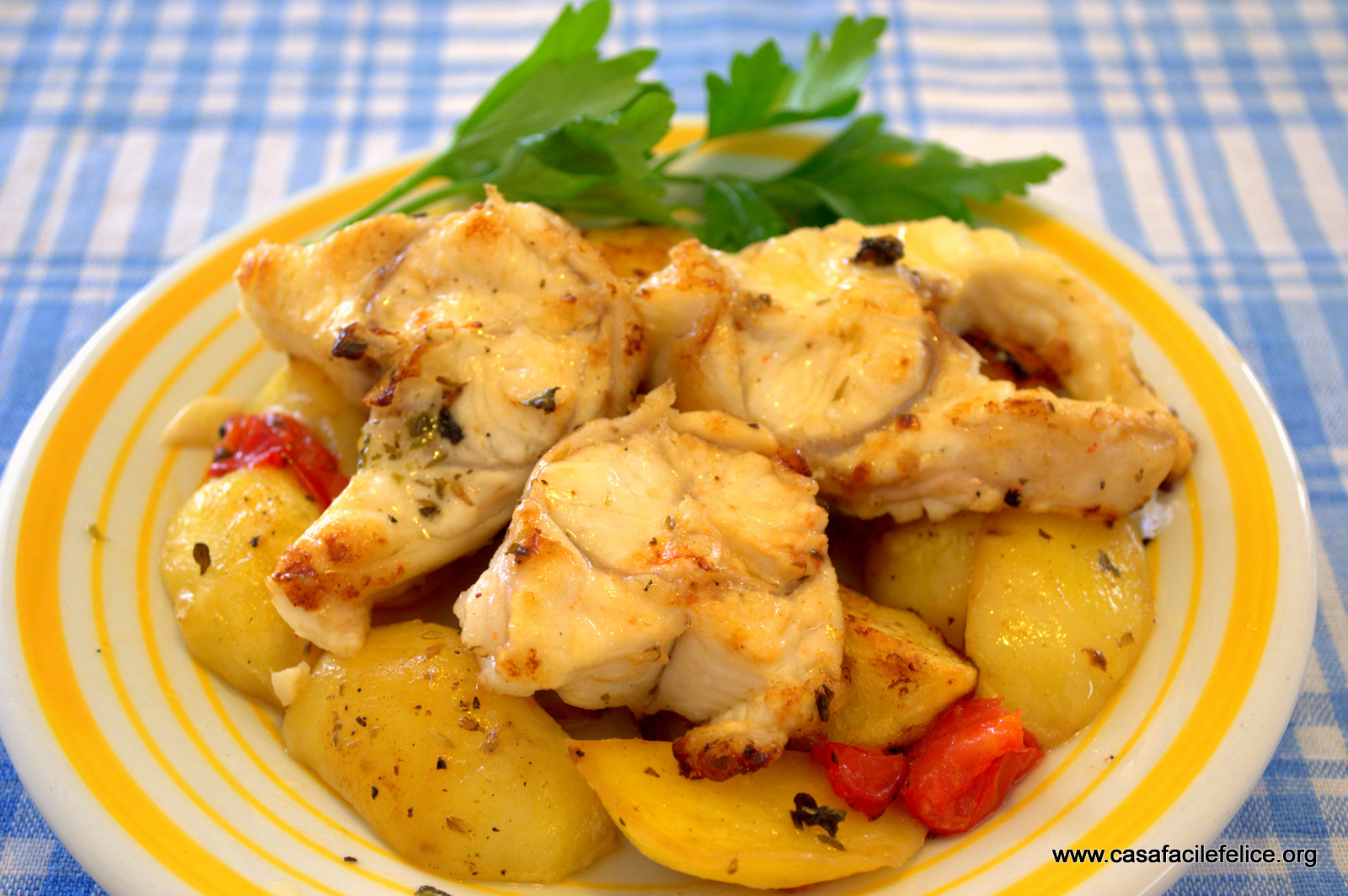 Quando le patate sono quasi cotte, aggiungete i tranci di murena, i pezzetti di pomodorini, gli aromi e rimettete in forno.