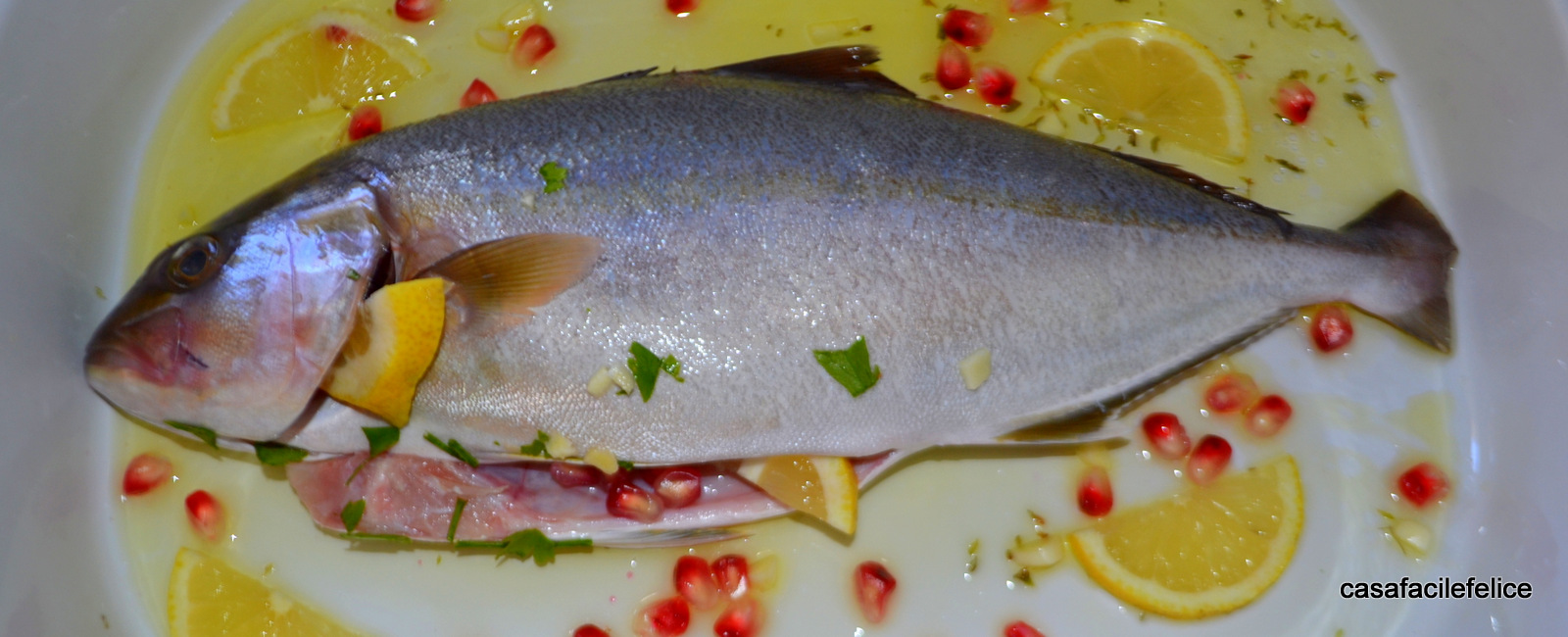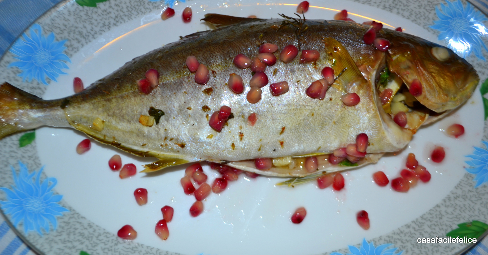 Eviscerate, sciacquate bene il pesce e farcite con qualche chicco di melograno, fette di mezzo limone, prezzemolo, aglio, sale e pepe.