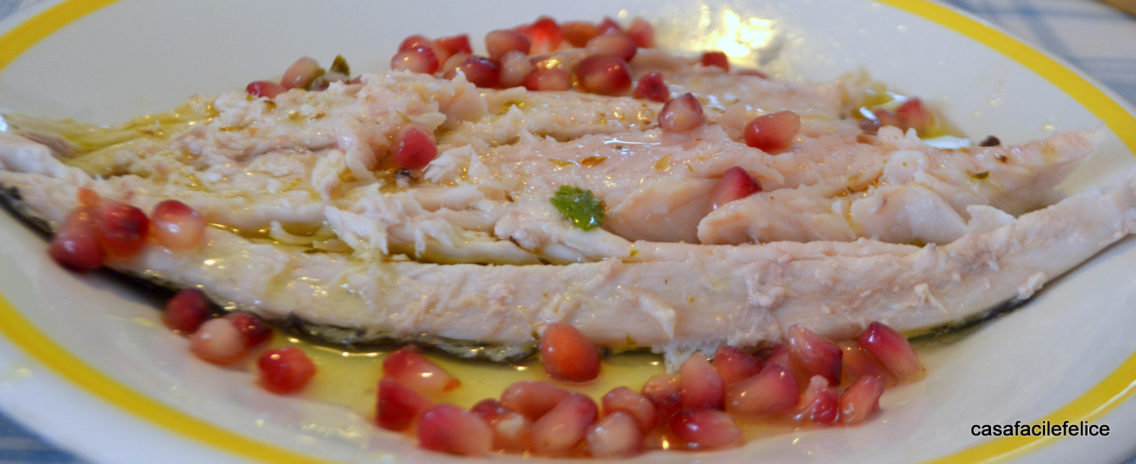 Antonietta 22/12/2014Ricetta antica, forse greca, adatta a chi ama il sapore dolce-aspro; è prevista la Ricciola ma si può utilizzare anche un altro pesce anche se la Ricciola è quella che ha carni bianche, morbide e tanto delicate da pareggiare il conto con l’aspro della melagrana, dando luogo ad un equilibrio perfetto di sapori e profumi intensi.