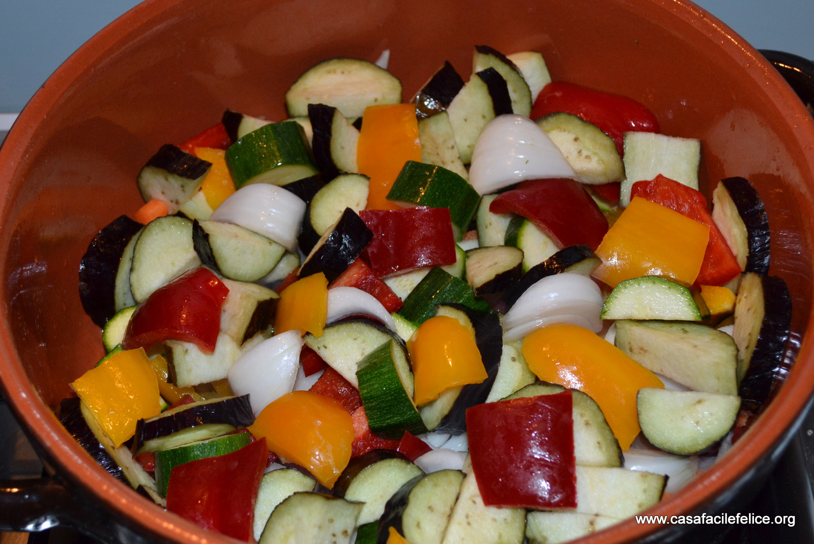 Tagliate tutte le verdure in pezzi piccoli, mettetele nella pentola di coccio calda, insieme agli aromi, l’olio, il vino e lasciate cuocere per 10 minuti circa. Non coprite e salate solo a fuoco spento, prima di servire.