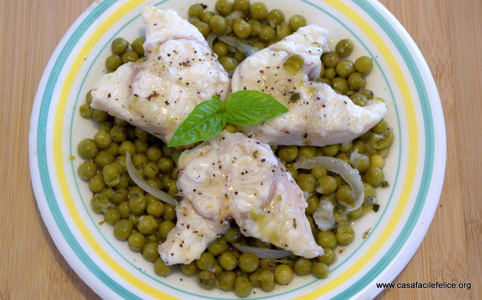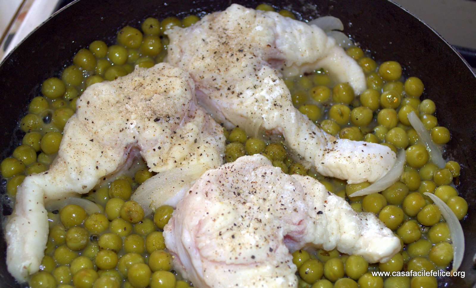 Intanto fate appassire le cipolle affettate con un po di aglio in un po di olio e unite i piselli. Fate cuocere un paio di minuti poi unite i tranci e fate cuocere altri 7 – 10 minuti circa (dipende dallo spessore dei tranci).