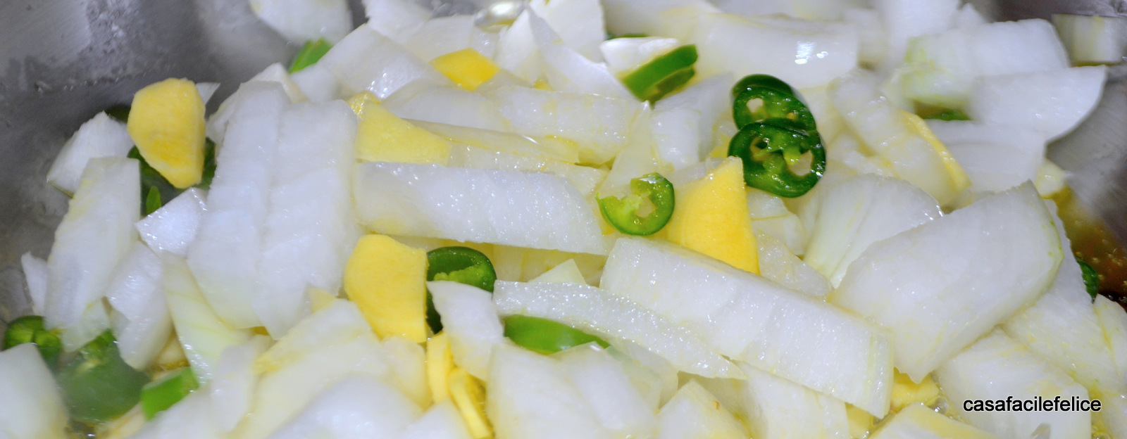 Tagliate la cipolla, lo zenzero e il peperoncino a pezzetti,