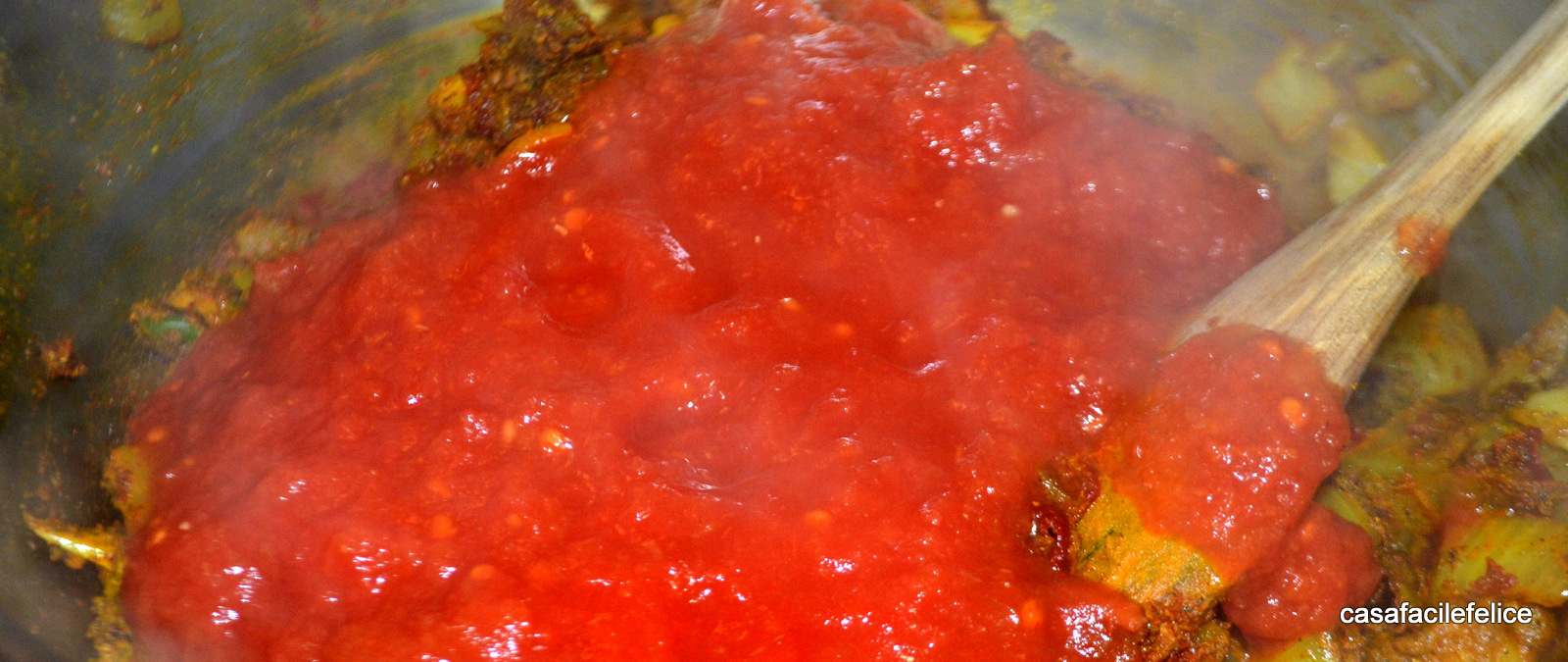 amalgamate tutto, mescolando accuratamente e aggiungete anche la polpa di pomodoro; lasciate cuocere 10 minuti.