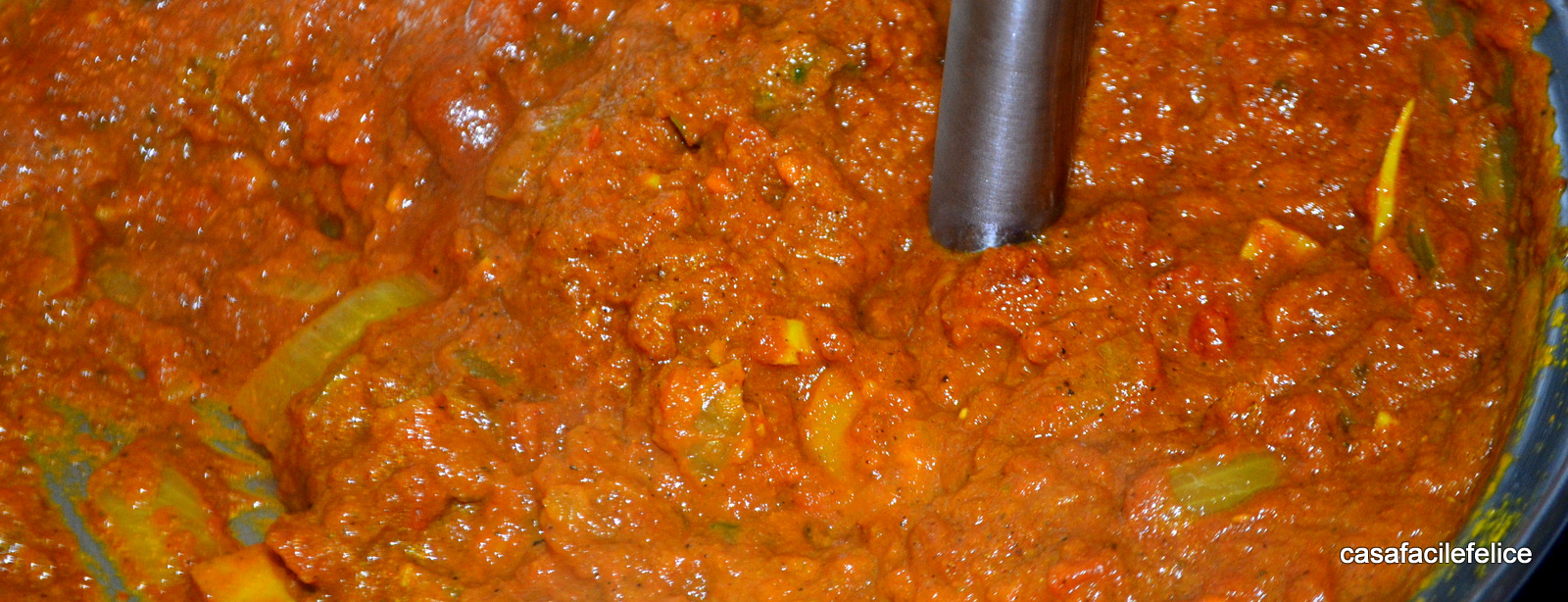 Quando sarà trascorso il tempo, frullate il sugo con un frullino ad immersione, toglietelo dalla padella e mettetelo in parte.