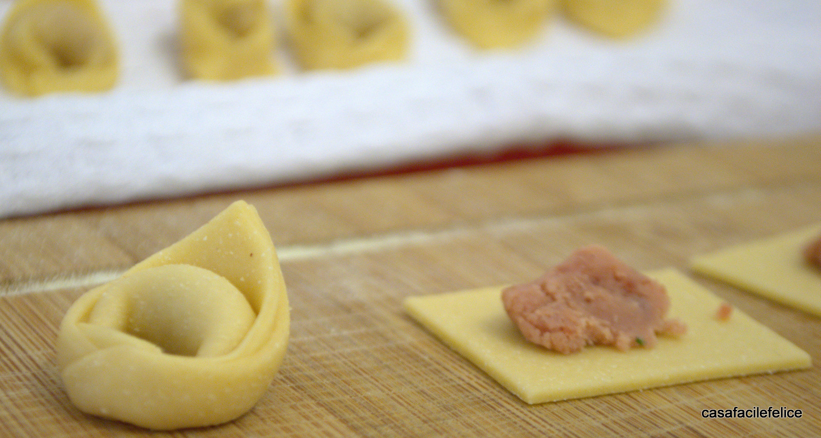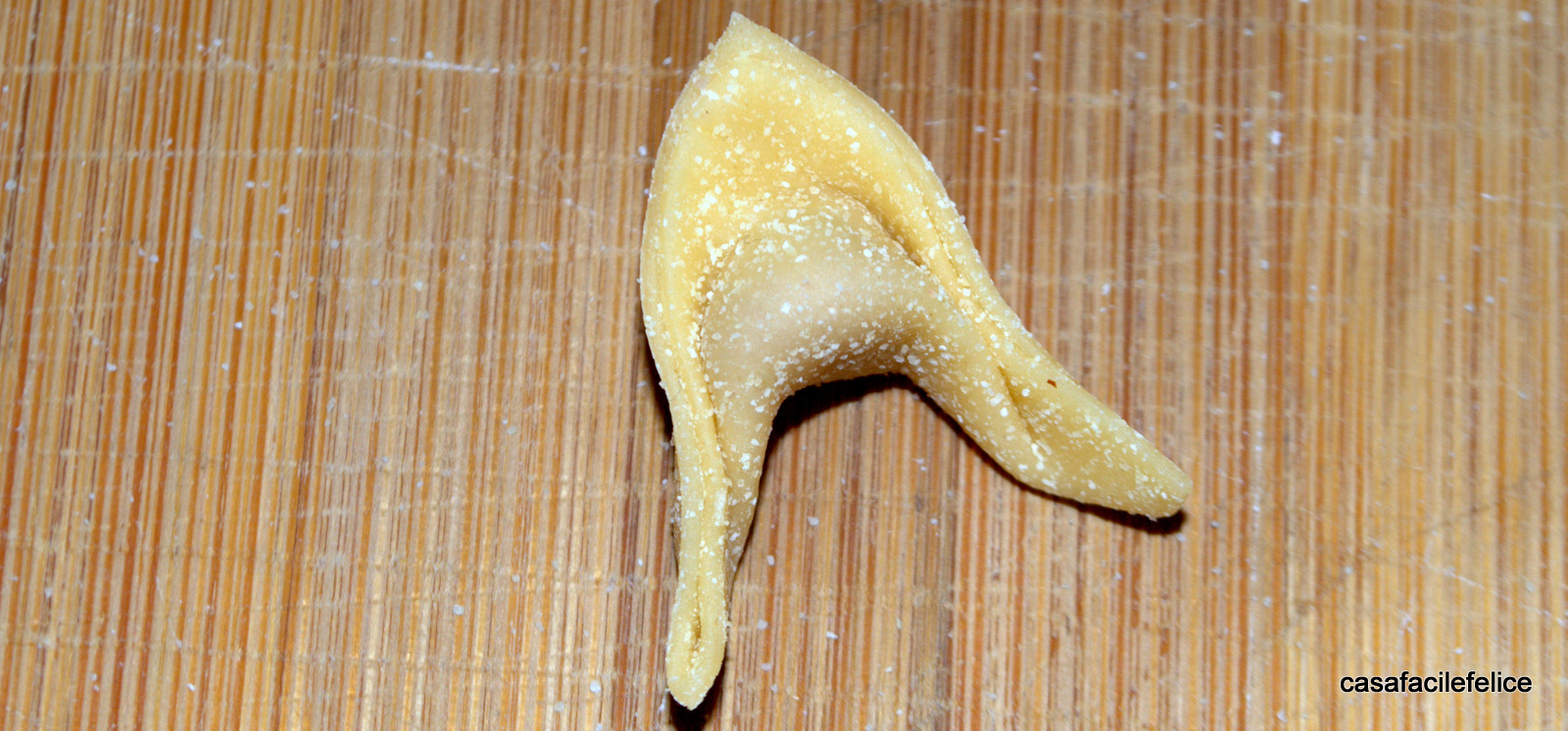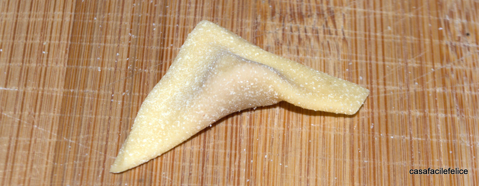 Stendete la sfoglia molto sottile, ritagliatela in quadrati di 3 cm di lato e mettete 1 grammo circa di ripieno su ognuno; piegate il quadrato lungo la diagonale, formando un triangolo;