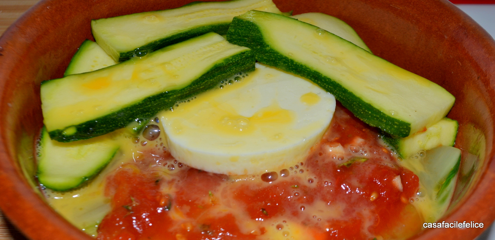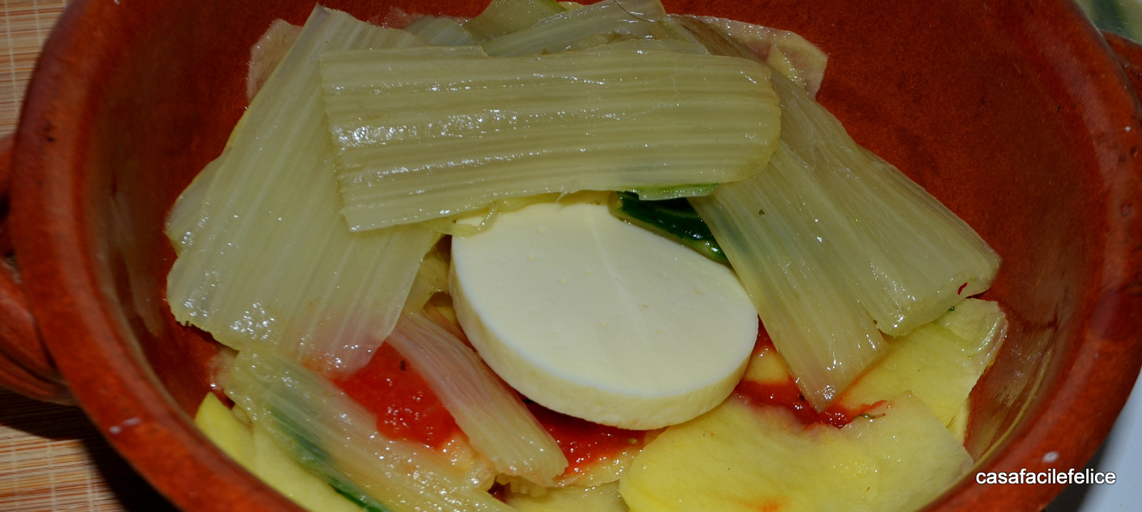 Lavate e tagliate a fette la zucchina e se sono troppo lunghe, tagliatele a metà; salate leggermente e mettete in parte. Sbucciate la patata e tagliatela a fette sottilissime, salate leggermente e mettete in parte. Condite i pomodori pelati con gli aromi, 1 cucchiaio di olio e un pizzico di sale. pomodori pelatiTagliate a fettine il provolone, in modo da averne almeno quattro fette per tegamino. provoloneSbattete l’uovo con un po di formaggio grattugiato. Eliminate i filamenti alle coste di bieta, lavatele e lessatele tre o quattro minuti o comunque quanto basta, perché abbiano la stessa cottura delle altre verdure; se sono troppo lunghe, tagliatele a metà. Ungete i tegamini, o un tegame unico che possa stare in forno e fate un primo strato con le patate, condite con un cucchiaio di sugo di pomodoro, un cucchiaio scarso di uovo sbattuto e aggiungete la fetta di provolone intera o a pezzetti.parmigiana verdure miste Coprite con le coste di bieta, distribuite ancora sugo di pomodoro, un cucchiaio scarso di uovo e il provolone. parmigiana verdure miste   Completate con le fette di zucchina, il sugo di pomodoro, l’uovo e il provolone  a pezzetti. parmigiana verdure miste  Passate in forno caldo per 20 – 25 minuti. parmigiana verdure miste  Trascorso il tempo, togliete dal forno, coprite con carta d’alluminio e lasciate riposare 5 minuti, prima di servire.parmigiana verdure miste  Altre ricette sono disponibili qui.