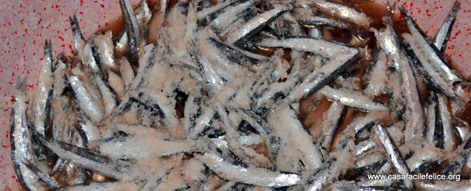 Cospargete con il sale, mescolate bene e lasciate macerare per 6 ore circa, per dare modo alle alici di perdere la maggior parte dei liquidi.