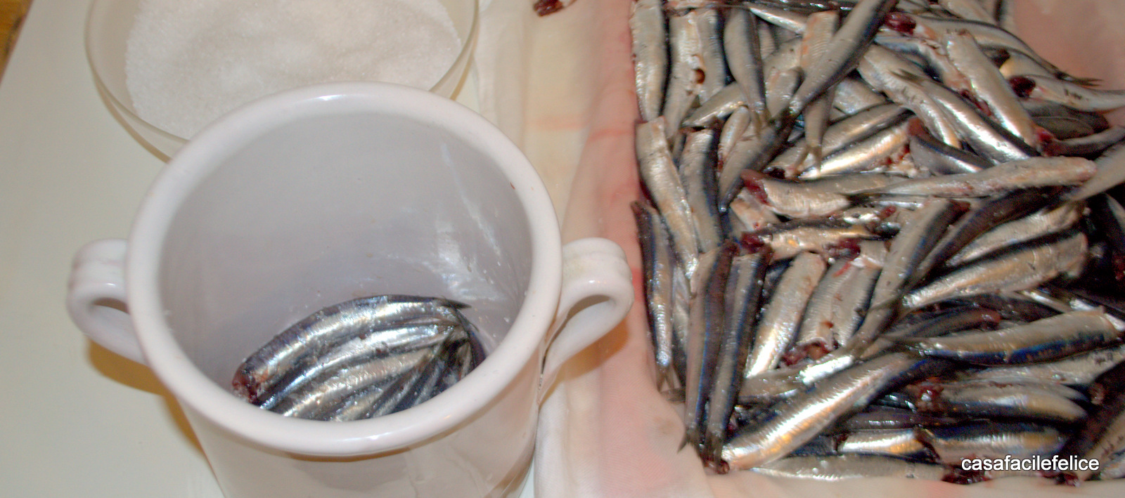 Preparate la salamoia a freddo, sciogliendo 100 grammi di sale fino per ogni litro di acqua occorrente e lavate delicatamente le alici; toglietele subito e poggiatele ad asciugare su un vassoio coperto da un canovaccio pulitissimo che non lasci pelucchi. Fate un leggero strato di sale sul fondo del vasetto, allineate le alici facendo in modo che il dorso di quella che segue nella fila, si appoggi sul ventre dell’alice che la precede. Le alici possono essere allineate in senso circolare, testa-coda e perpendicolarmente, dipende dalla grandezza dei pesci e del vaso scelto; cospargete di sale ogni fila allineata. Se non trovate il mezzo sale, usate il sale grosso dopo averlo opportunamente pestato nel mortaio o con un pestacarne.