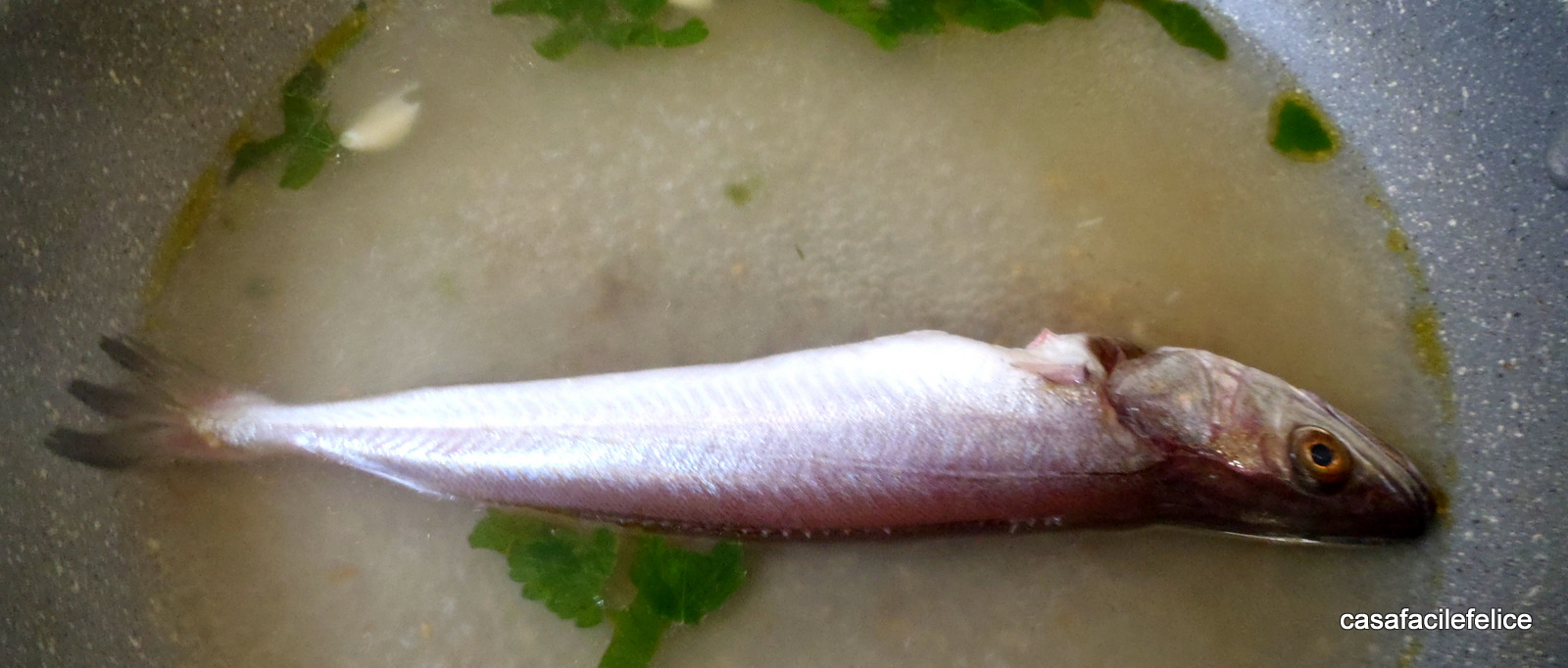 Quando è il momento, adagiate il pesce nel brodo, aggiungete un po di prezzemolo, uno spicchio di aglio schiacciato, un po di olio e fate cuocere 3 minuti coperto.