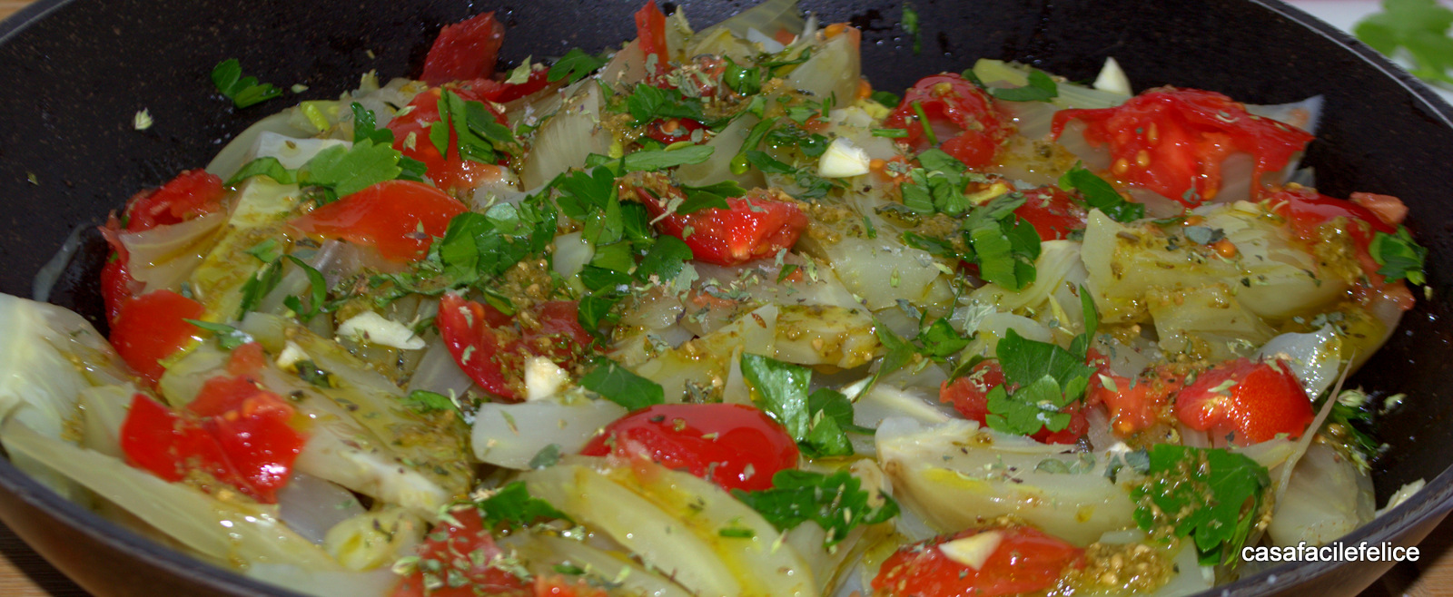 Mettete un filo di olio in una padella capiente, aggiungete metà pomodorini, aglio a pezzetti, origano, prezzemolo e basilico tritati; mettete le fette di finocchi e aggiungete l’altra metà degli aromi e dei pomodorini a pezzetti; aggiustate di sale versate un filo di olio, un po di pepe e fate cuocere a fuoco medio per 10 minuti, coperto.