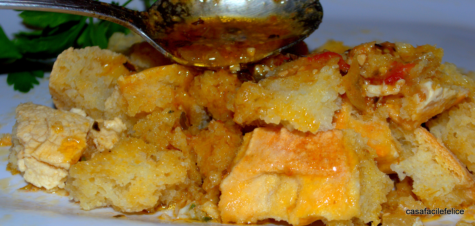 Oppure si può fare come ho fatto io: prendete un paio di biscotti di pane integrale (freselle), inumiditeli sotto l’acqua corrente, giusto qualche secondo, metteteli in un piatto e distribuite il fondo di cottura sul pane. Non ve ne pentirete!