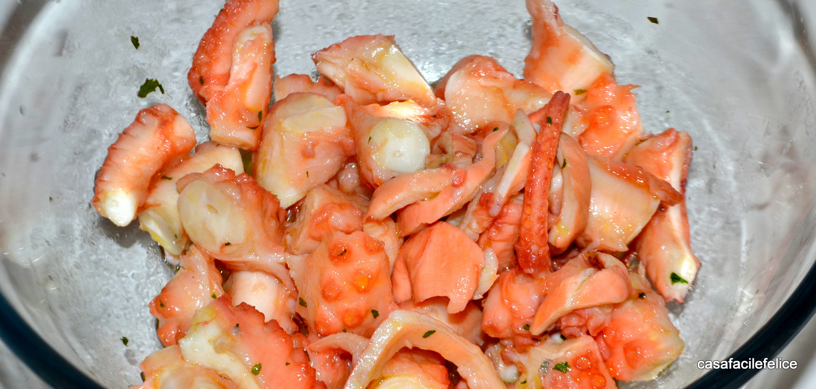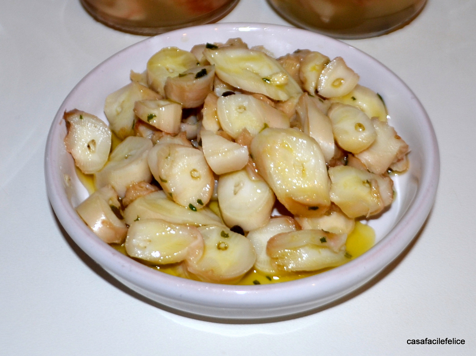 E’ consigliabile che i pezzi siano tolti dal loro liquido di governo, tagliati a fettine sottili e conditi con olio d’oliva e altri aromi: prezzemolo, aglio,… .