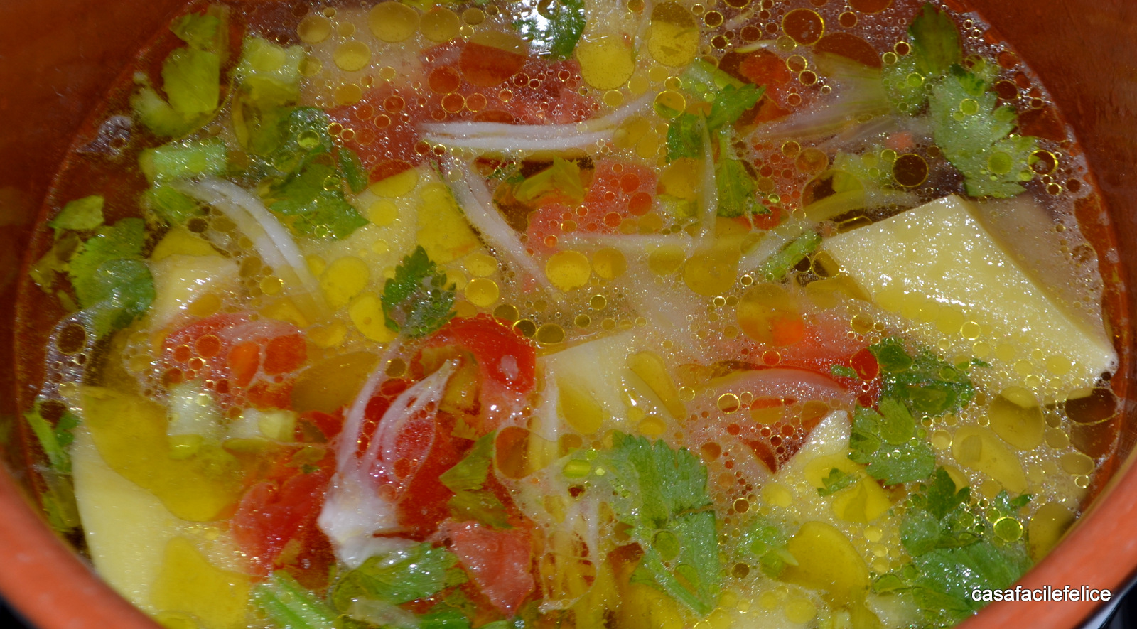 Sbucciate le patate, tagliatele in quattro parti e lavatele in acqua corrente; lavate e tagliate a pezzettini il sedano, la cipolla e l’aglio; lavate i pomodorini, privateli dei semi e tagliateli a pezzettini. Mettete un filo d’olio nella pentola, aggiungete tutti gli ingredienti e fate profumare qualche minuto, coprite con abbondante acqua e lasciate bollire per mezz’ora o fino alla cottura delle patate.