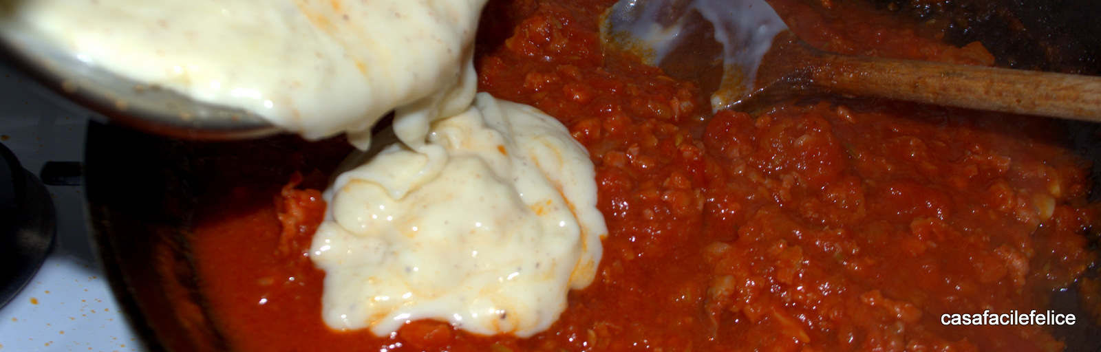 Quando il sugo sarà cotto, aggiungete la besciamella e mescolate bene.