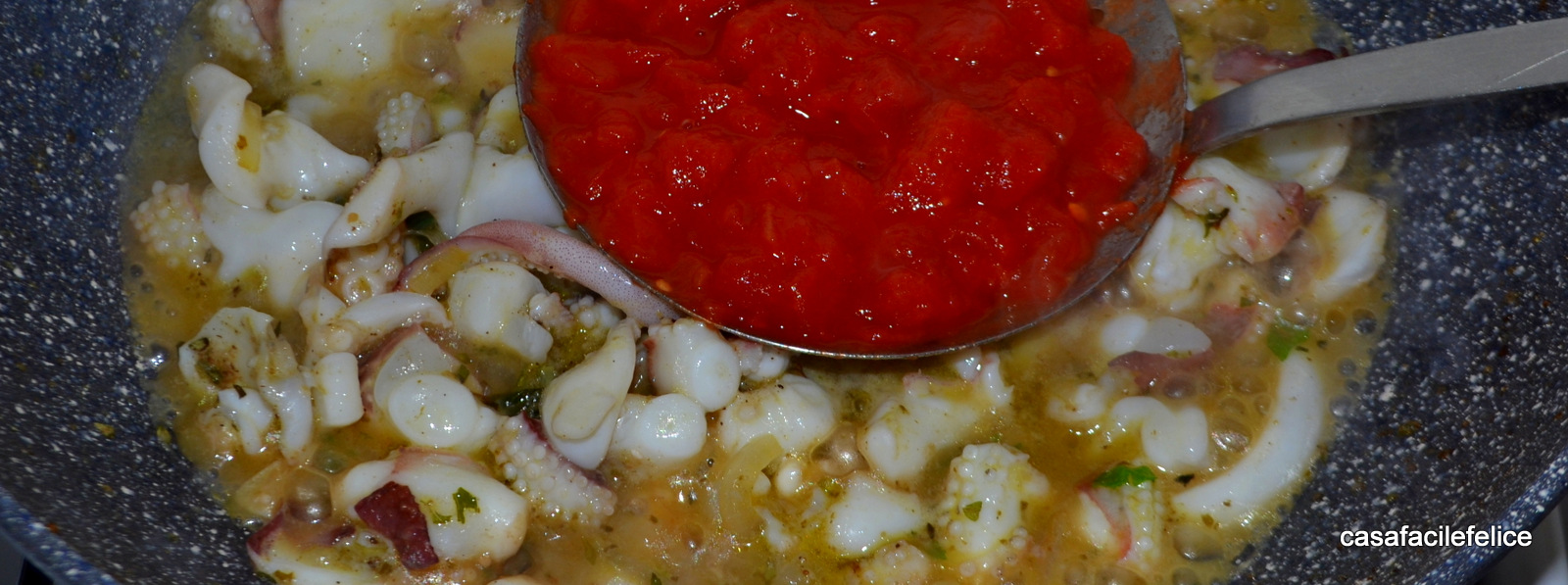 Aggiungete i pomodori a pezzetti, privati dei semi. Aggiusate di sale e pepe e fate cuocere per 30 minuti, aggiungendo acqua bollente se dovesse asciugarsi troppo.