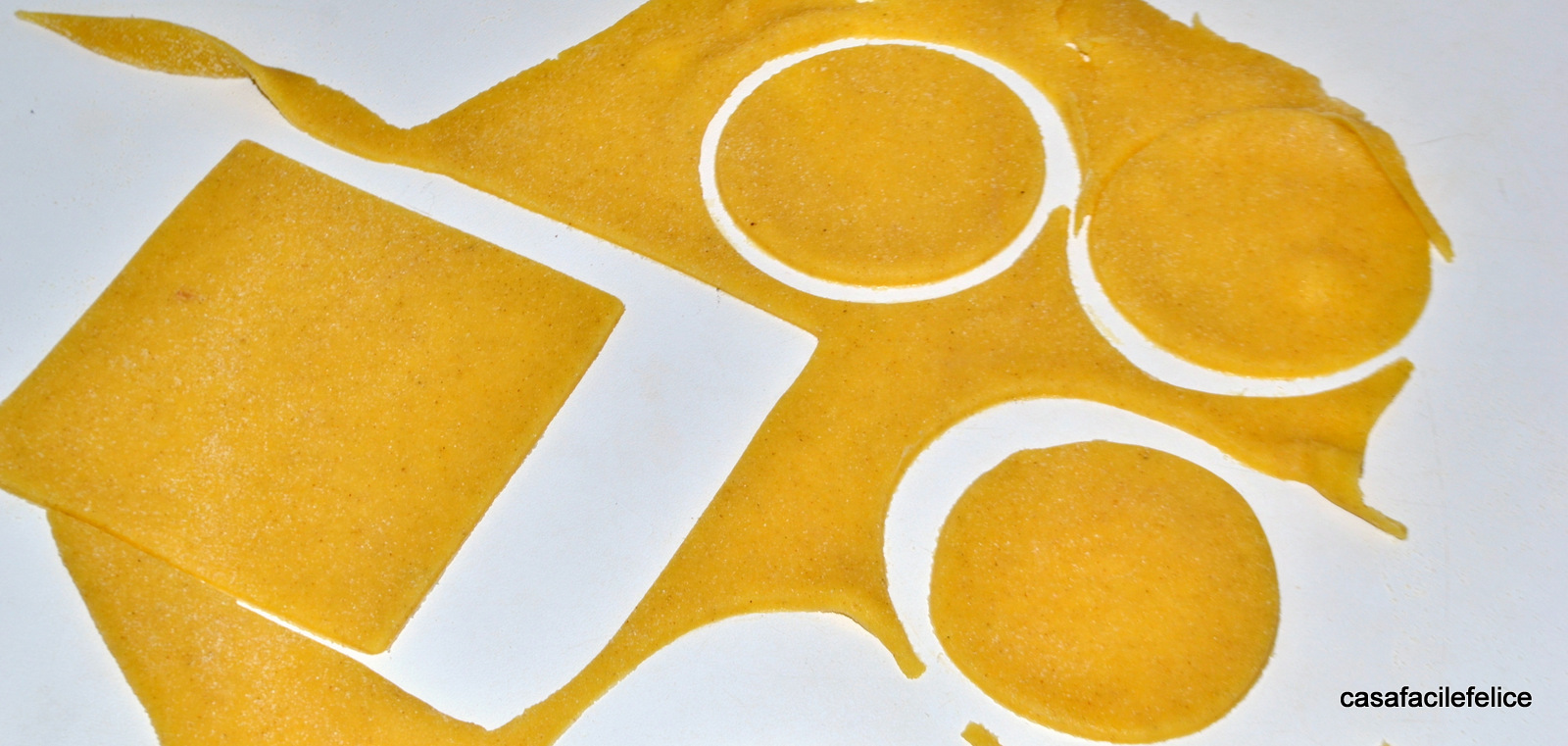 Trascorso il tempo di riposo, spolverate il piano di lavoro con un po di farina di semola e tirate la sfoglia fino ad avere uno spessore di 3 – 4 millimetri; ritagliate dalla sfoglia dischi o quadrati della misura desiderata. Impastate i ritagli di pasta e ritagliate altre piadine dalla sfoglia.