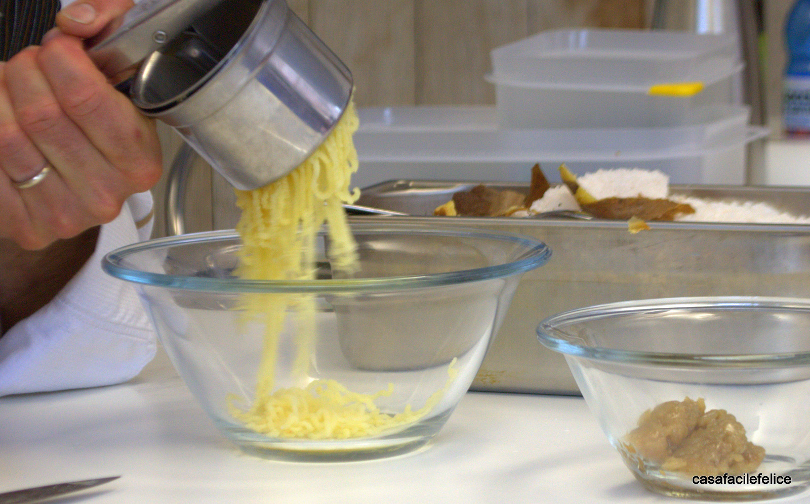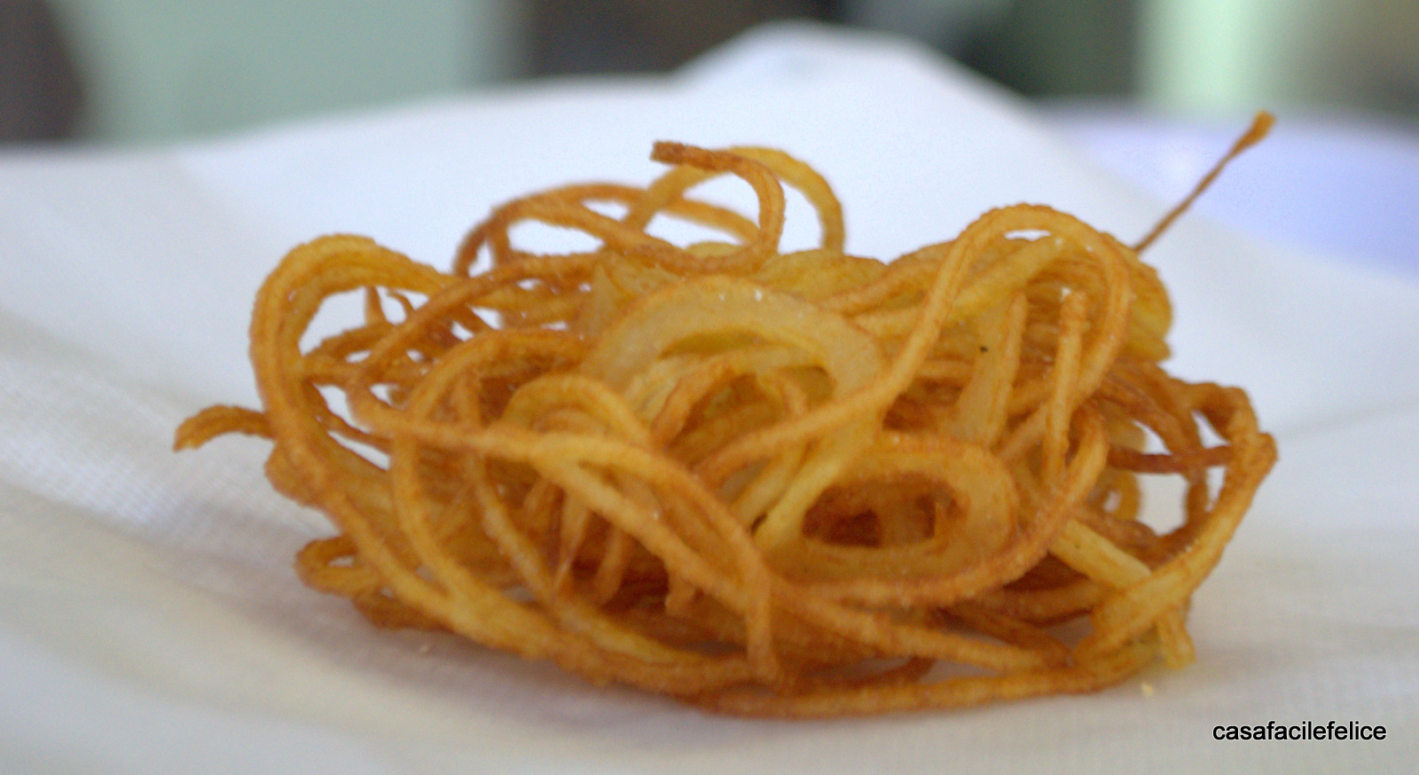Sbucciate la patata e passatela nel tornio così da ottenere tante striscioline sottili e lunghe come spaghetti che metterete su carta assorbente.